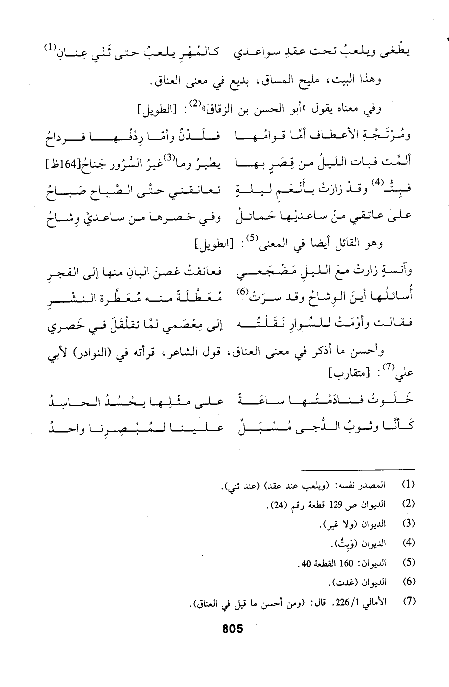 وأحسن ما أذكر في معنى العناق، قول الشاعر، قرأته في (النوادر) لأبي علي: