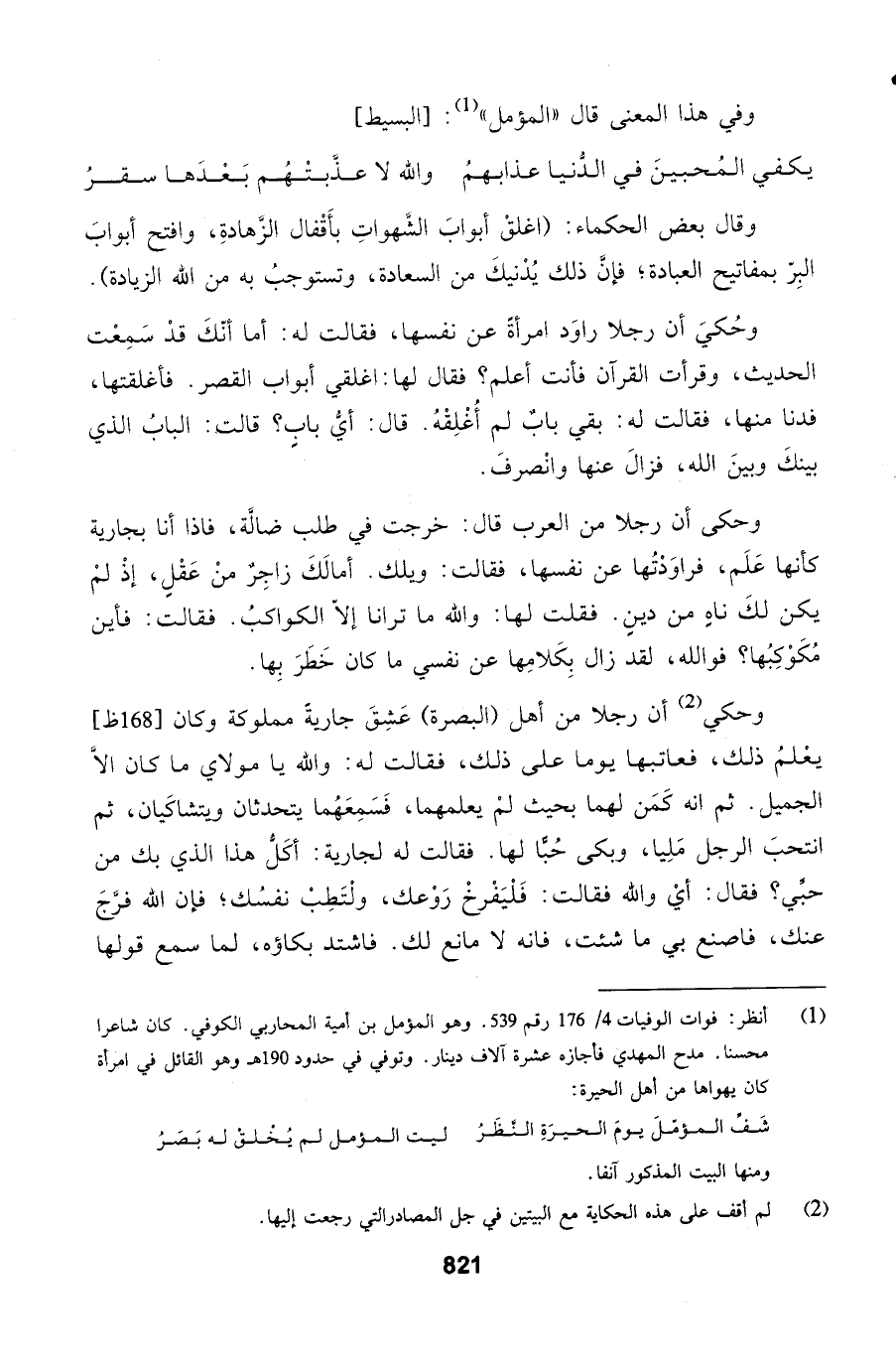 ويتشاكَيان، ثم انتحبَ الرجل مَلِيا، وبكى حُبّاً لها. فقالت له لجارية: أكَلُّ هذا الذي بك من حبِّي؟ فقال: