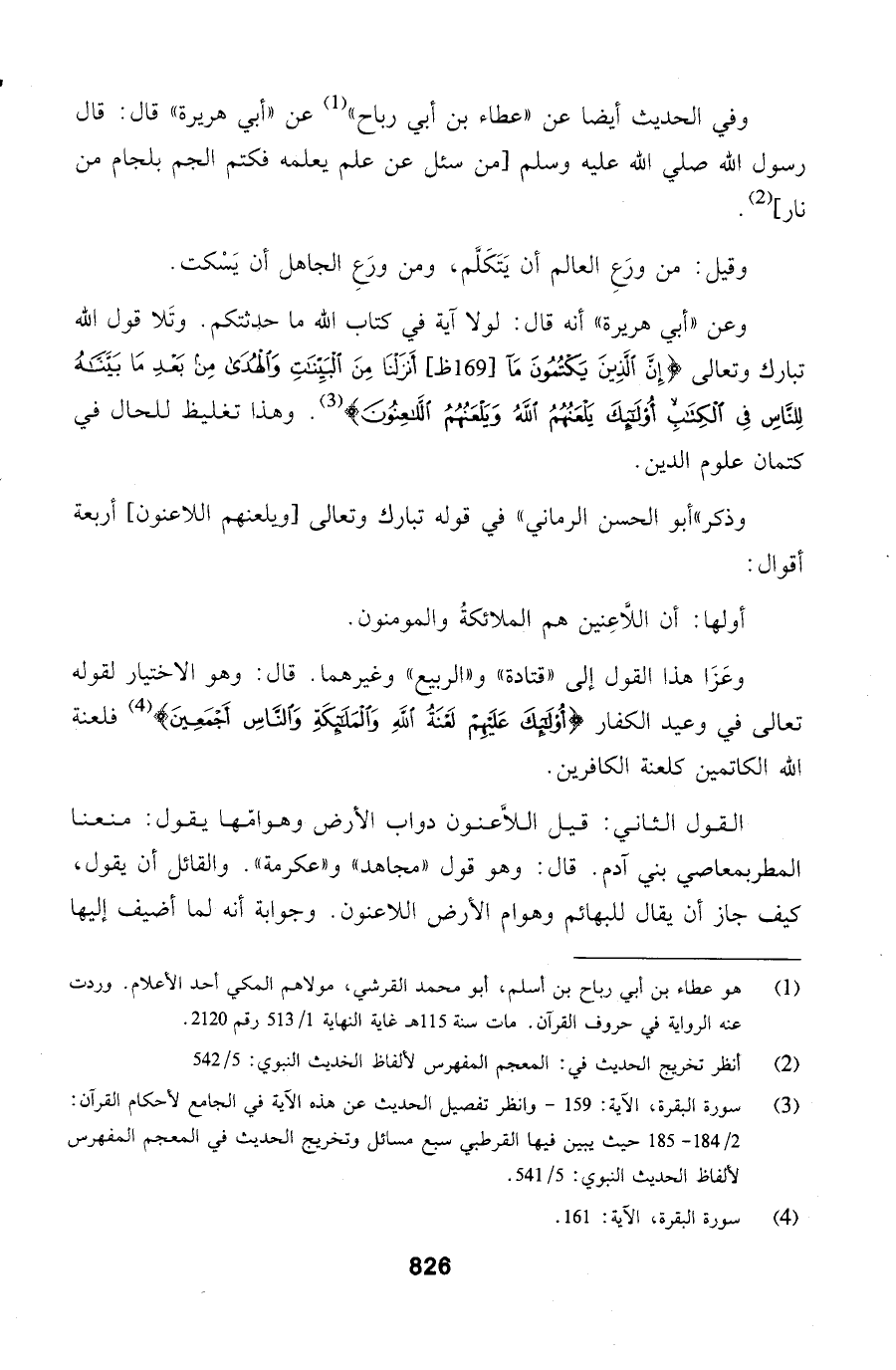 وعن أبي هريرة أنه قال: لولا آية في كتاب الله ما حدثتكم. وتَلا قول الله تبارك وتعالى (إِنَّ الَّذِينَ يَكْتُمُونَ مَا أَنْزَلْنَا مِنَ الْبَيِّنَاتِ وَالْهُدَى مِنْ بَعْدِ مَا بَيَّنَّاهُ لِلنَّاسِ فِي الْكِتَابِ أُولَئِكَ يَلْعَنُهُمُ اللَّهُ وَيَلْعَنُهُمُ اللَّاعِنُونَ). وهذا