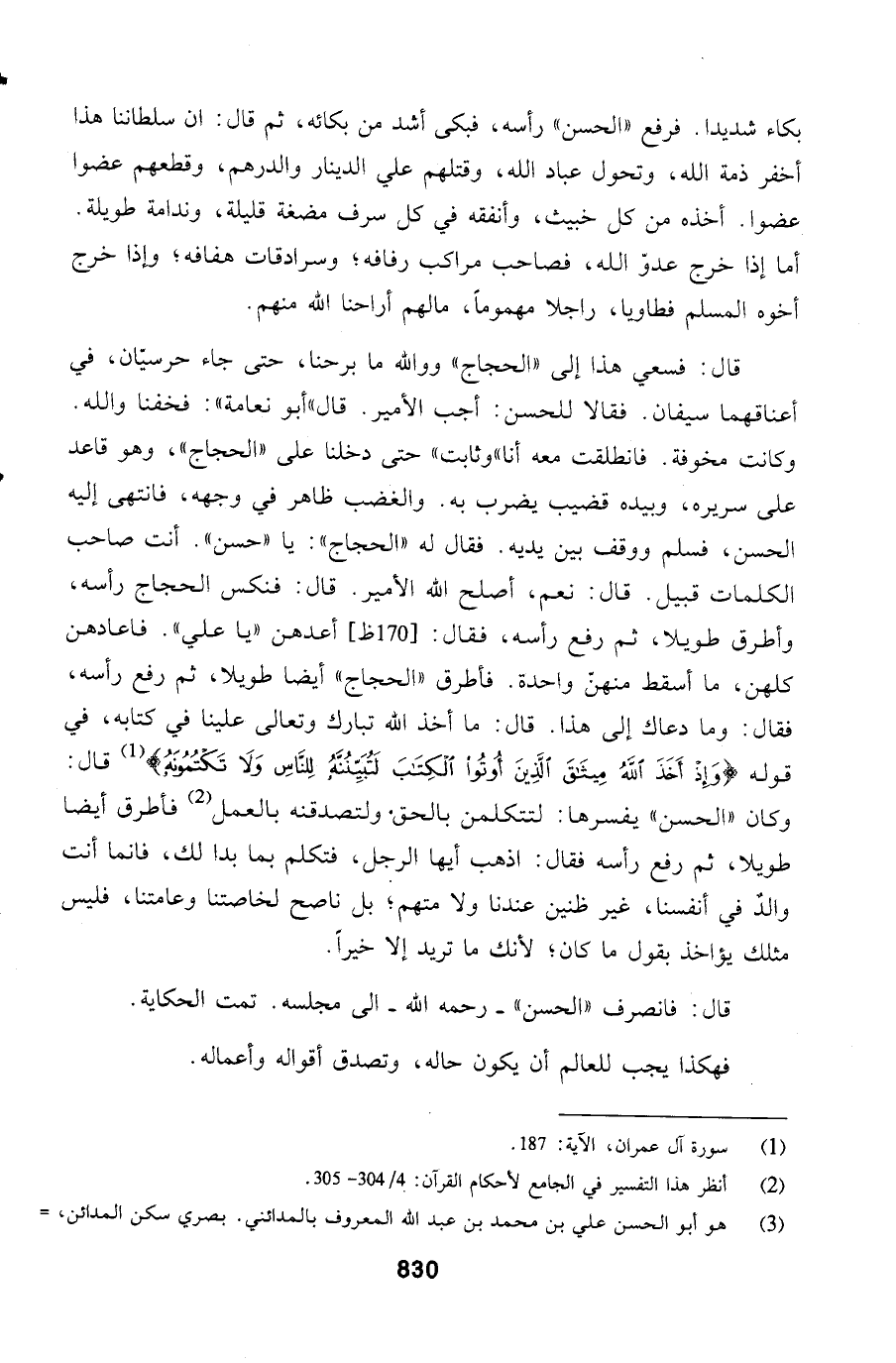 قال: فانصرف الحسن - رحمه الله - الى مجلسه. تمت الحكاية.