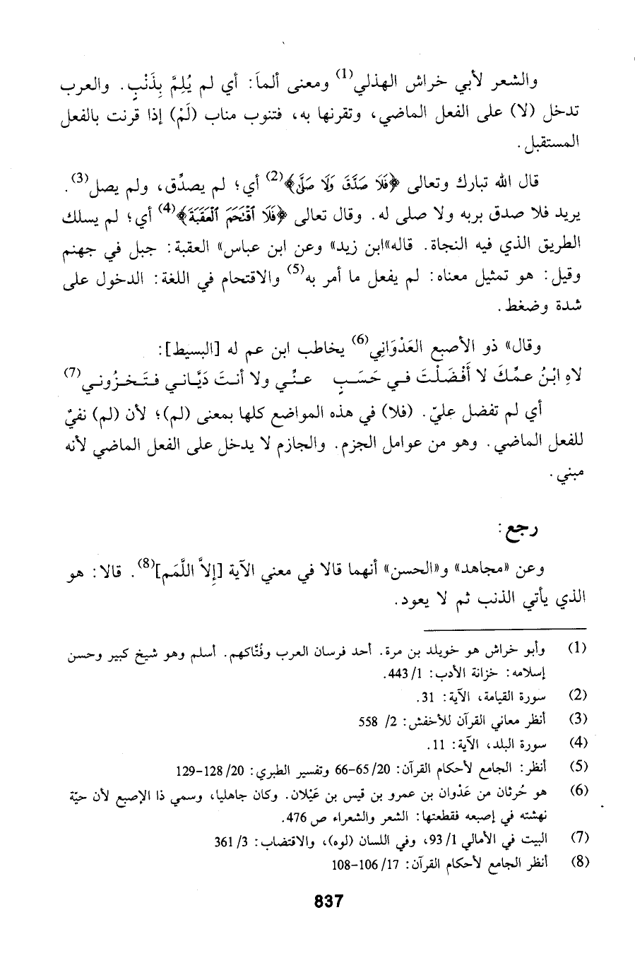 والشعر لأبي خراش الهذلي ومعنى ألماَ: أي لم يُلِمَّ بِذَنْبٍ. والعرب تدخل (لا) على الفعل الماضي،