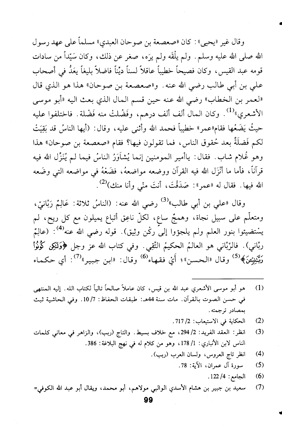 عاقلاً لسناً ديِّناً فاضلاً بليغاً يعَدُّ في أصحاب علي بن أبي طالب رضي الله عنه. وصعصعة بن