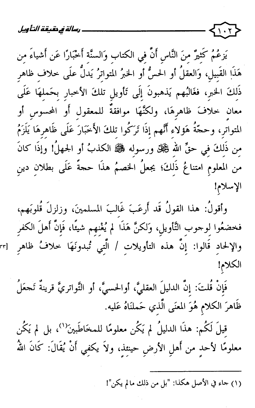 وأقول: هذا القول قد أرعب غالب المسلمين وزلزل قلوبهم، فخضعوا لوجوب التأويل، ولكن هذا لا يغنهم شيئا، فإن أهل الكفر والإلحاد قالوا: إن هذه التأويلات التي تبدونها خلاف ظاهر الكلام!