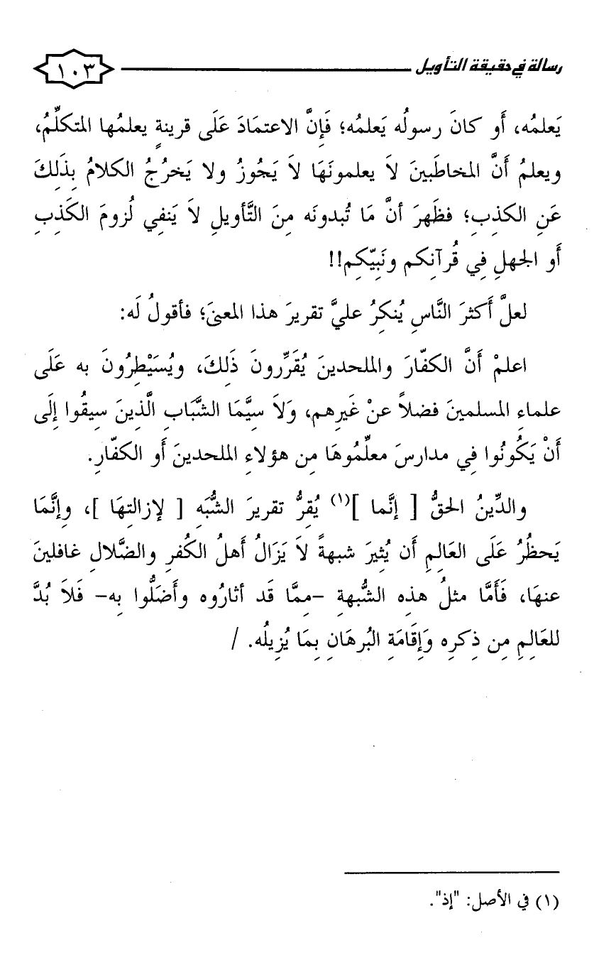والدين الحق إنما يقر تقرير الشبه لإزالتها، وإنما يحظر على العلم أن يثير شبهة لا يزال أهل الكفر والضلال غافلين عنها، فأما مثل هذه الشبهة - مما قد أثاروه وأضلوا به - فلا بد للعالم من ذكره وإقامة البرهان بما يزيله.