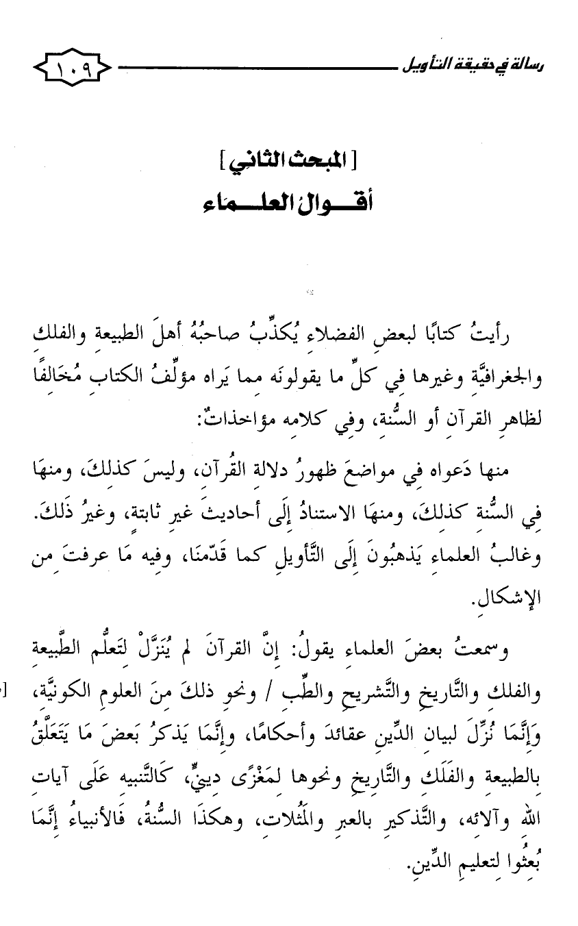 وسمعت بعض العلماء يقول: إن القرآن لم ينزل لتعلم الطبيعة والفلك والتاريخ والتشريح والطب ونحو ذلك من العلوم الكونية، وإنما نزل لبيان الدين عقائد وأحكاما، وإنما يذكر بعض ما يتعلق بالطبيعة والفلك والتاريخ ونحوها لمغزى ديني، كالتنبيه على آيات الله وآلائه، والتذكير بالعبر والمثلات، هكذا السنة، فالأنبياء إنما بعثوا لتعليم الدين.