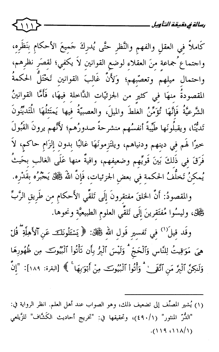 كاملا في العقل والفهم والنظر حتى يدرك جميع الأحكام بنظره، واجتماع جماعة من العقلاء لوضع القوانين لا يكفي، لقصر نظرهم واحتمال ميلهم وتعصبهم، ولأن غالب القوانين تختل الحكمة المقصودة منها في كثر من الجزئيات الداخلة فيها؛ فأما القوانين الشرعية فإنها تؤمن الغلط والميل والعصبية فيها، يمتثلها المتدينون تدينا ويقبلونها طيبة أنفسهم منشرحة صدورهم؛ لأنهم يرون القبول خيرا لهم في دينهم ودنياهم، ويلزمونها غالبا بدون إلزام حاكم؛ لا فرق في ذلك بين قويهم وضعيفهم، وافية منها على الغالب بحيث يمكن تخلف الحكمة في بعض الجزئيات، فإن الله عز وجل يجبره بقدره.