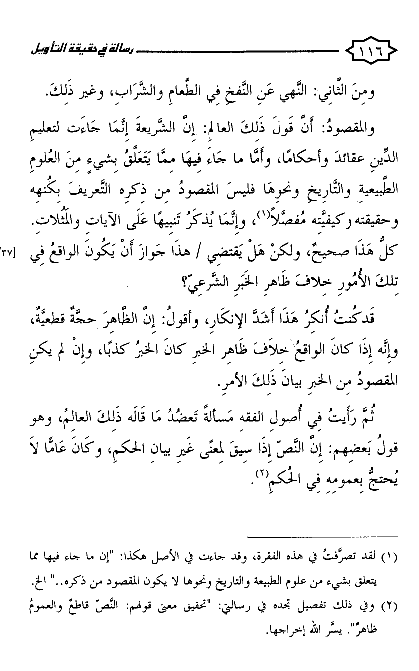 والمقصود: أن قول ذلك العالم: إن الشريعة إنما جاءت لتعليم الدين عقائد وأحكاما، وأما ما جاء فيها مما يتعلق بشيء من العلوم الطبيعية والتاريخ ونحوها فليس المقصود من ذكره التعريف بكنهه وحقيقته وكيفيته مفصلا، وإنا يذكر تنبيها على الآيات والمثلات. كل هذا صحيح، ولكن هل يقتضي هذا جواز أن يكون الواقع في تلك الأمور خلاف ظاهر الخبر الشرعي؟