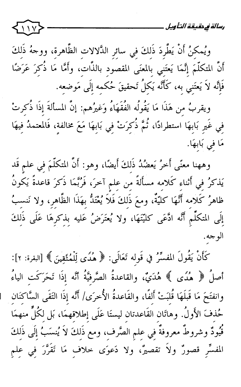 وههنا معنى آخر يعضد ذك أيضا، وهو أن المتكلم في علم قد يذكر في أثناء كلامه مسألة من علم آخر، فربما ذكر قاعدة يكون ظاهر كلامه أنها كلية، ومع ذلك فلا يعتد بهذا الظاهر ولا ننسب إلى المتكلم أنه ادعى كليتها ولا يعترض عليه بذكرها على ذلك الوجه.