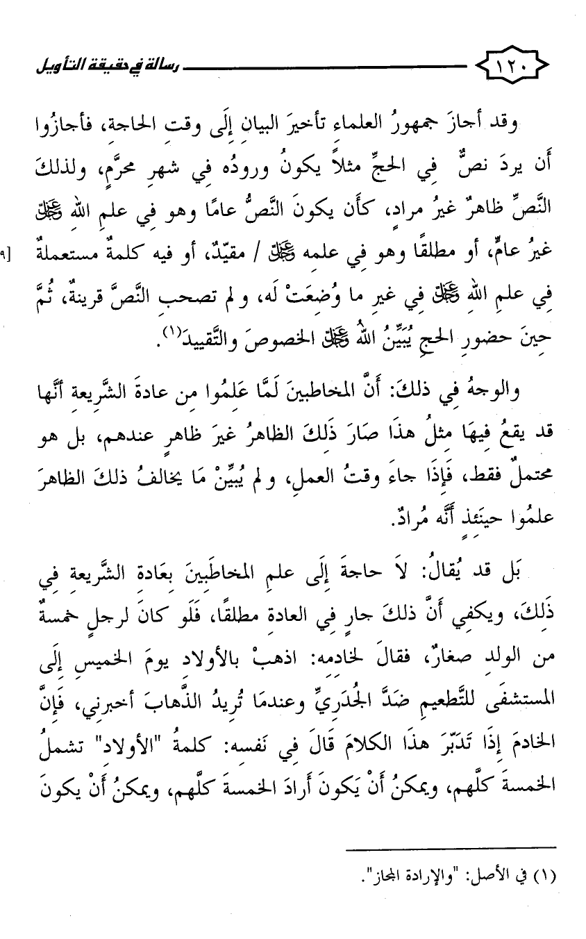 وقد أجاز جمهور العلماء تأخير البيان إلى وقت الحاجة، فأجازوا أن يرد نص في الحج مثلا يكون وروده في شهر محرم، ولذلك غير عام، أو مطلقا وهو في علمه عز وجل مقيد، أو فيه كلمة مستعملة في علم الله عز وجل في غير ما وضعت له، ولم تصحب النص قرينة، ثم حين حضور الحج يبين الله عز وجل الخصوص والتقييد.