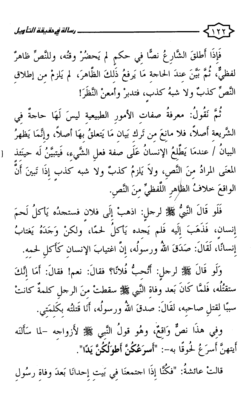 ثم نقول: معرفة صفات الأمور الطبيعية ليس لها حاجة في البيان عندما يطلع الإنسان على صفة فعل الشيء، فيتبين له حينئذ المعنى المراد من النص، ولا يلزم كذب ولا شبه كذب إذا تبين أن الواقع خلاف الظاهر اللفظي من النص.