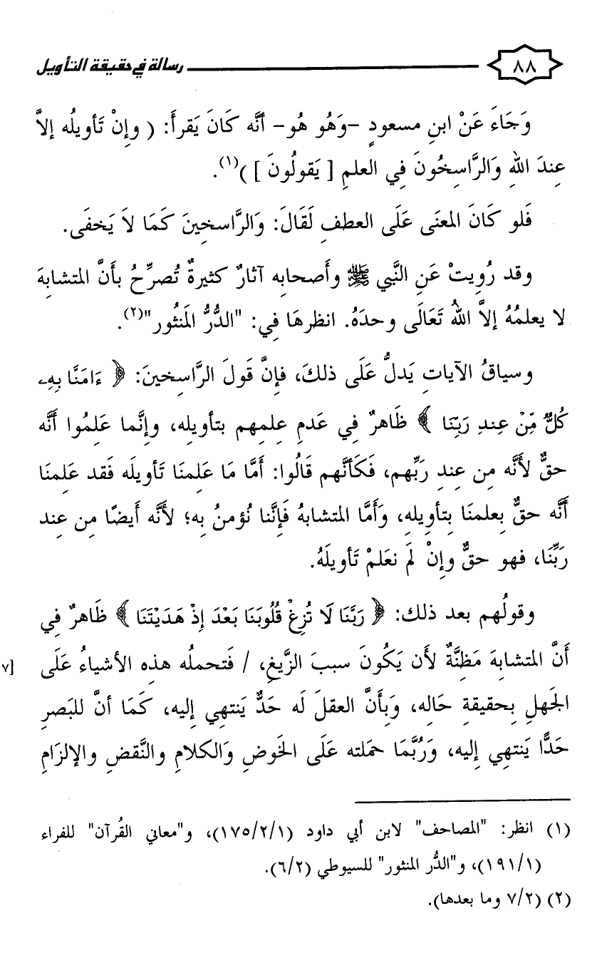 وقد رويت عن النبي - صلى الله عليه وسلم - وأصحابه آثار كثيرة تصرح بأن المتشابه لا يعلمه إلا الله تعالى وحده. انظرها في الدر المنثور.