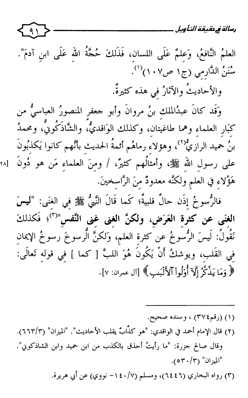 فالرسوخ إذن حال قلبية، كما قال النبي - صلى الله عليه وسلم - في الغنى: «ليس الغنى عن كثرة العرض، ولكن الغنى غنى النفس»؛ فكذلك تقول: ليس الرسوخ عن كثرة العلم، ولكن الرسوخ رسوخ الإيمان في القلب، ويوشك أن يكون هو اللب كما في قوله تعالى: {وما يتذكر إلا أولو الألباب}