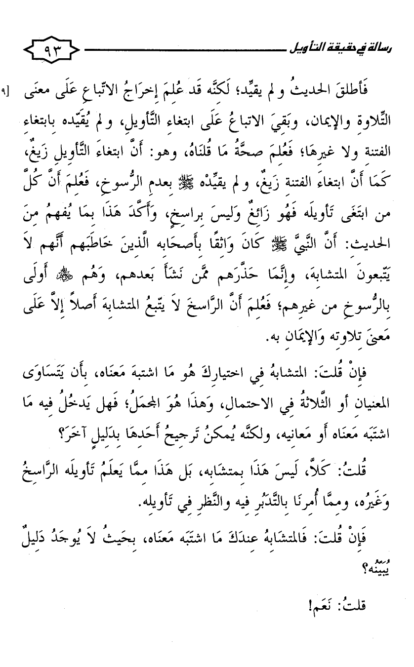 فإن قلت: فالمتشابه عندك ما اشتبه معناه، بحيث لا يوجد دليل يبينه؟