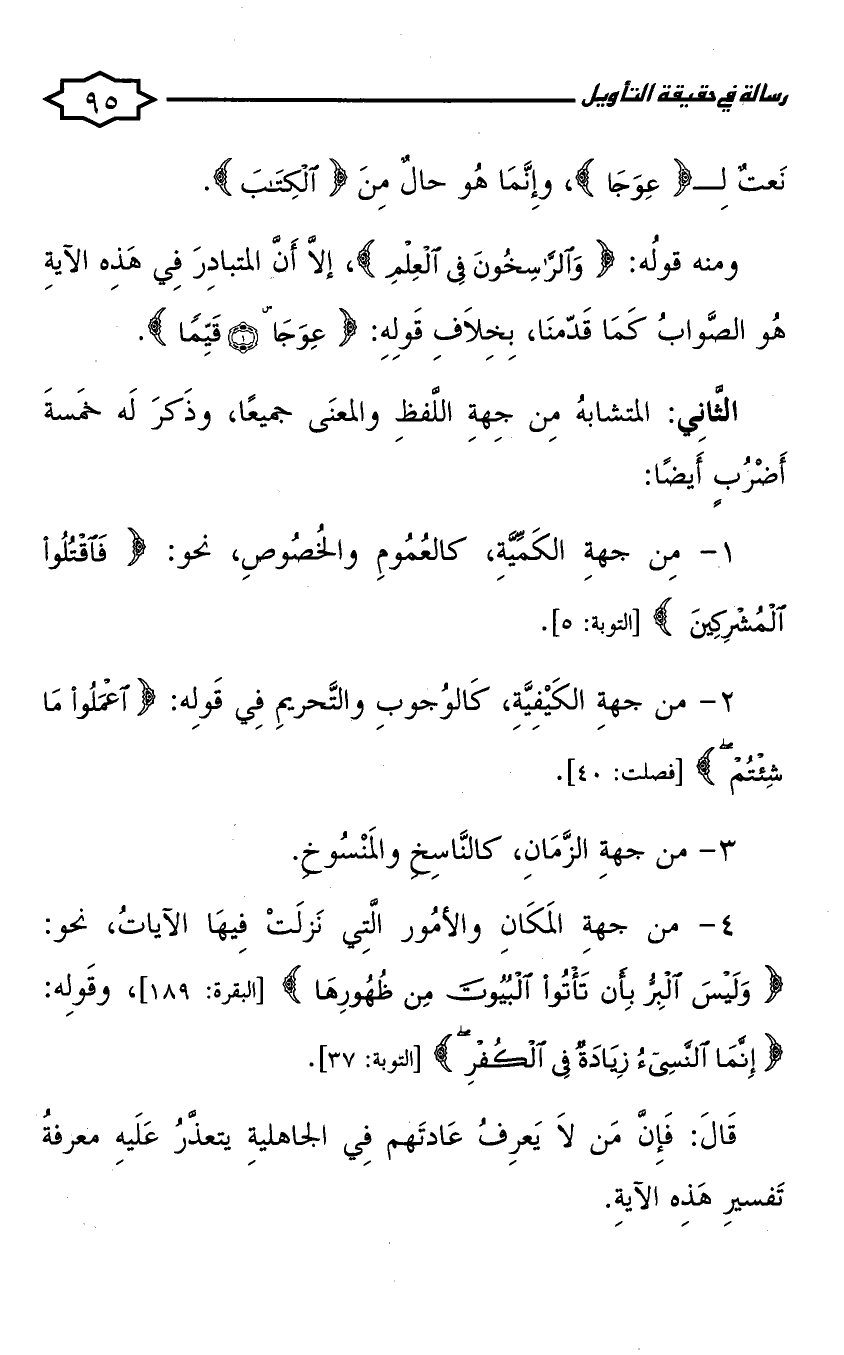 الثاني: المتشابه من جهة اللفظ والمعنى جميعا، وذكر له خمسة أضرب أيضا:
