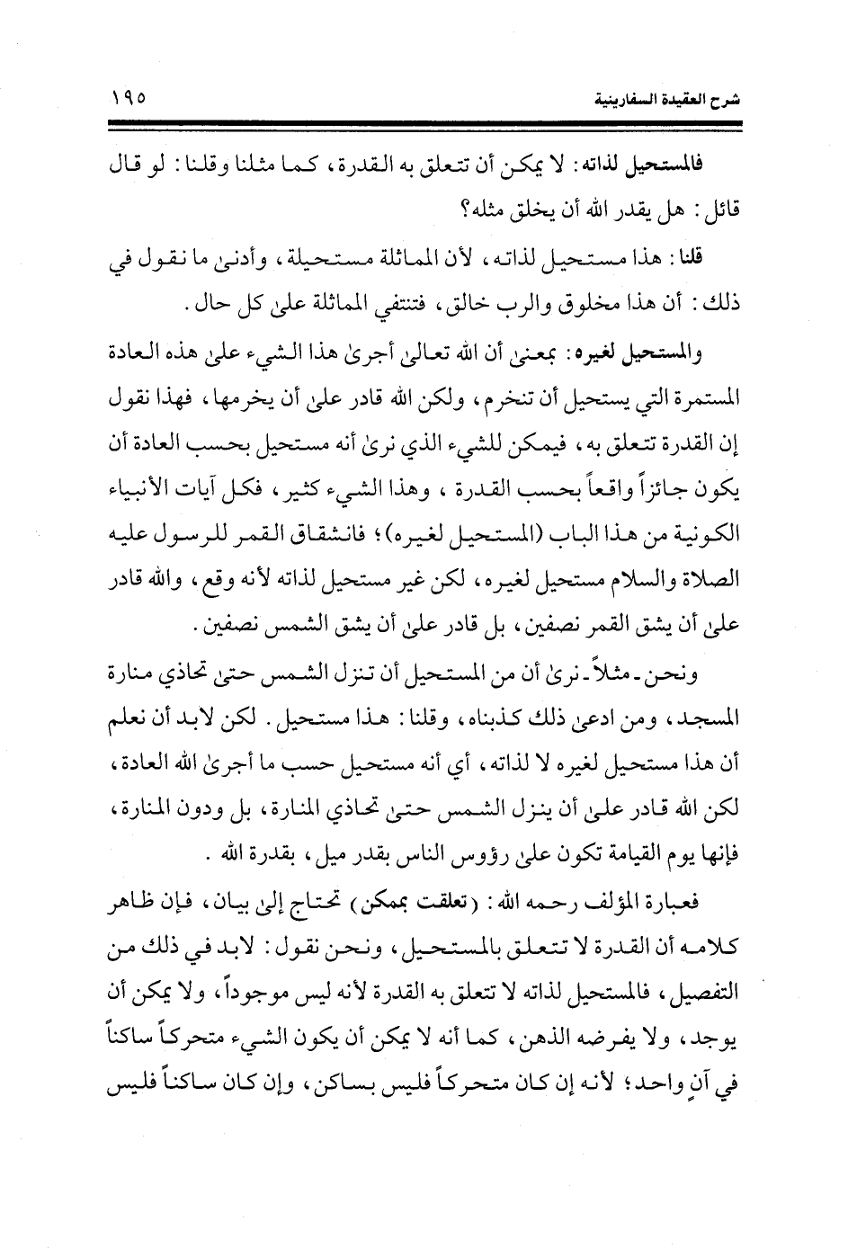ونحن - مثلا - نرى أن من المستحيل أن تنزل الشمس حتى تحاذي منارة المسجد، ومن ادعى ذلك كذبناه، وقلنا: هذا مستحيل. لكن لابد أن نعلم أن هذا مستحيل لغيره لا لذاته، أي أنه مستحيل حسب ما أجرى الله العادة، لكن الله قادر على أن ينزل الشمس حتى تحاذي المنارة، بل ودون المنارة، فإنها يوم القيامة تكون على رؤوس الناس بقدر ميل، بقدرة الله.
