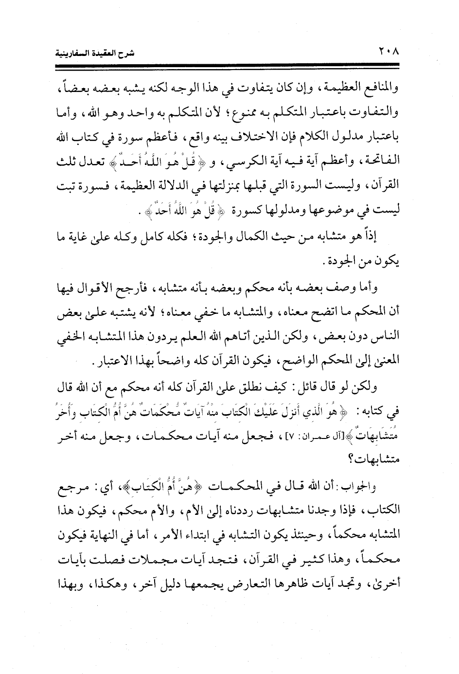 والمنافع العظيمة، وإن كان يتفاوت في هذا الوجه لكنه يشبه بعضه بعضا، والتفاوت باعتبار المتكلم به ممنوع؛ لان المتكلم به واحد وهو الله، وأما باعتبار مدلول الكلام فإن الاختلاف بينه واقع، فأعظم سورة في كتاب الله الفاتحة، وأعظم آية فيه آية الكرسي، و (قُلْ هُوَ اللَّهُ أَحَدٌ) (الإخلاص: 1) تعدل ثلث القرآن، وليست السورة التي قبلها بمنزلتها في الدلالة العظيمة، فسورة تبت ليست في موضوعها ومدلولها كسورة (قُلْ هُوَ اللَّهُ أَحَدٌ) (الإخلاص: 1)