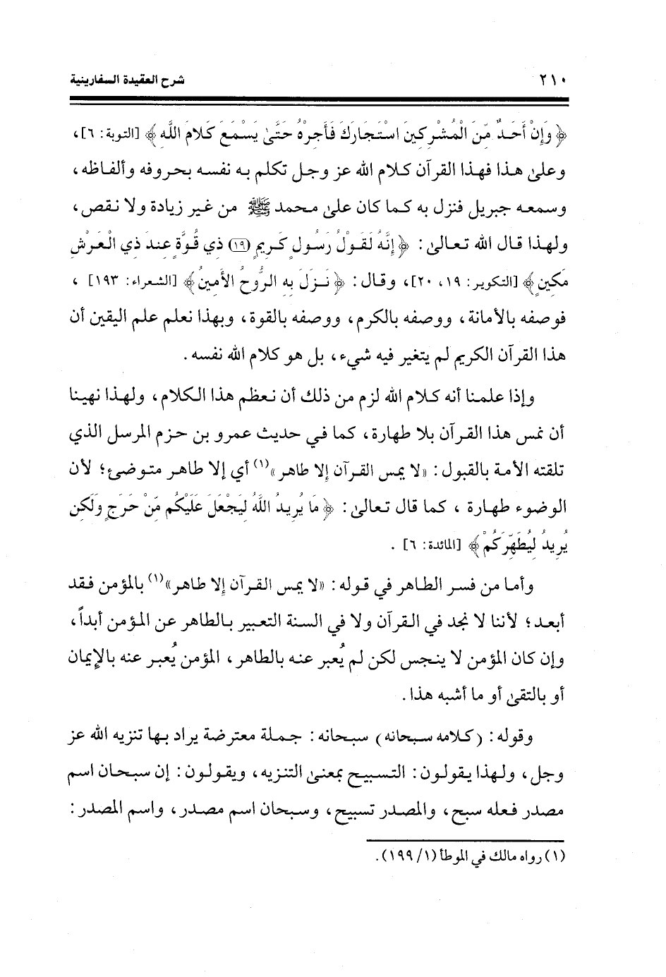 وإذا علمنا أنه كلام الله لزم من ذلك أن نعظم هذا الكلام، ولهذا نهينا أن نمس هذا القرآن بلا طهارة، كما في حديث عمرو بن حزم المرسل الذي تلقته الأمة بالقبول: ((لا يمس القرآن إلا طاهر) أي إلا طاهر متوضئ؛ لأن الوضوء طهارة، كما قال تعالى: (مَا يُرِيدُ اللَّهُ لِيَجْعَلَ عَلَيْكُمْ مِنْ حَرَجٍ وَلَكِنْ يُرِيدُ لِيُطَهِّرَكُمْ) (المائدة: الآية 6) .