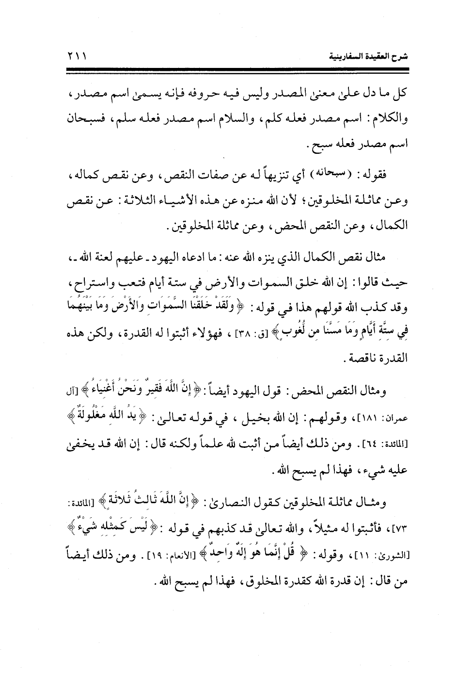 فقوله: (سبحانه) أي تنزيها له عن صفات النقص، وعن نقص كماله، وعن مماثلة المخلوقين؛ لان الله منزه عن هذه الأشياء الثلاثة: عن نقص الكمال، وعن النقص المحض، وعن مماثلة المخلوقين.