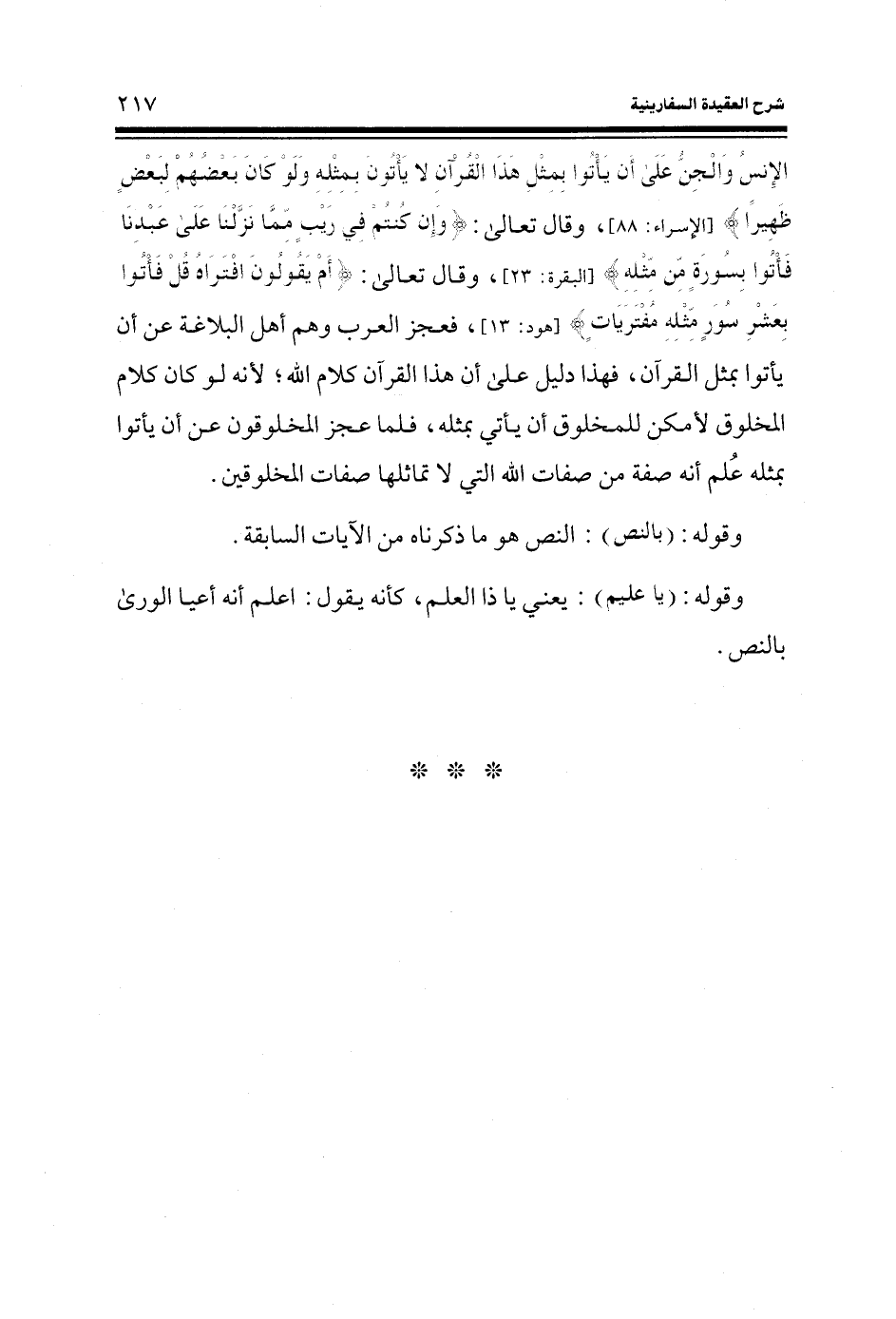 الْأِنْسُ وَالْجِنُّ عَلَى أَنْ يَأْتُوا بِمِثْلِ هَذَا القرآن لا يَأْتُونَ بِمِثْلِهِ وَلَوْ كَانَ بَعْضُهُمْ لِبَعْضٍ ظَهِيراً) (الإسراء: 88)) ، وقال تعالى: (وَإِنْ كُنْتُمْ فِي رَيْبٍ مِمَّا نَزَّلْنَا عَلَى عَبْدِنَا فَأْتُوا بِسُورَةٍ مِّنْ مِثْلِهِ) (البقرة: الآية 23) ، وقال تعالى: (أَمْ يَقُولُونَ افْتَرَاهُ قُلْ فَأْتُوا بِعَشْرِ سُوَرٍ مِثْلِهِ مُفْتَرَيَاتٍ) (هود: الآية 13) ، فعجز العرب وهم أهل البلاغة عن أن يأتوا بمثل القرآن، فهذا دليل على أن هذا القرآن كلام الله؛ لأنه لو كان كلام المخلوق لأمكن للمخلوق أن يأتي بمثله، فلما عجز المخلوقون عن أن يأتوا بمثله عُلَمَ أنه صفة من صفات الله التي لا تماثلها صفات المخلوقين.