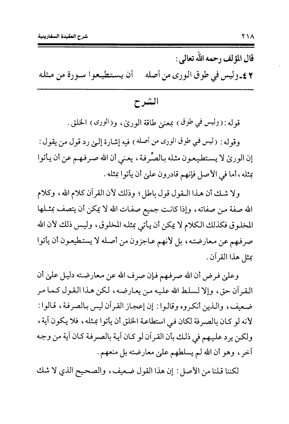 42- وليس في طوق الورى من أصله ... أن يستطيعوا سورة من مثله