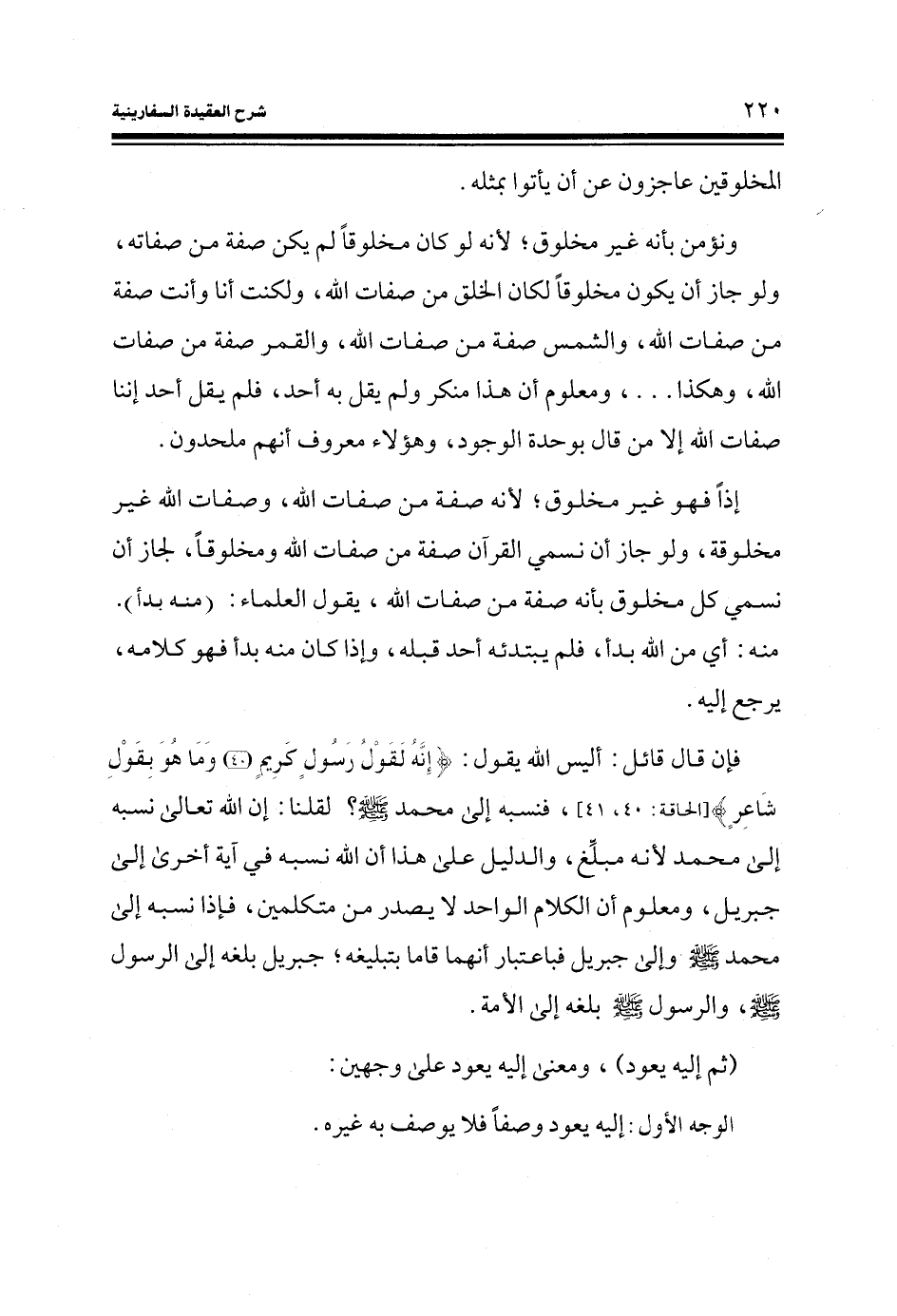 ونؤمن بأنه غير مخلوق؛ لأنه لو كان مخلوقا لم يكن صفة من صفاته ولو جاز أن يكون مخلوقا لكان الخلق من صفات الله، ولكنت أنا وأنت صفة من صفات الله، والشمس صفة من صفات الله، والقمر صفة من صفات الله، وهكذا ... ، ومعلوم أن هذا منكر ولم يقل به أحد، فلم يقل أحد إننا صفات الله إلا من قال بوحدة الوجود، وهؤلاء معروف أنهم ملحدون.