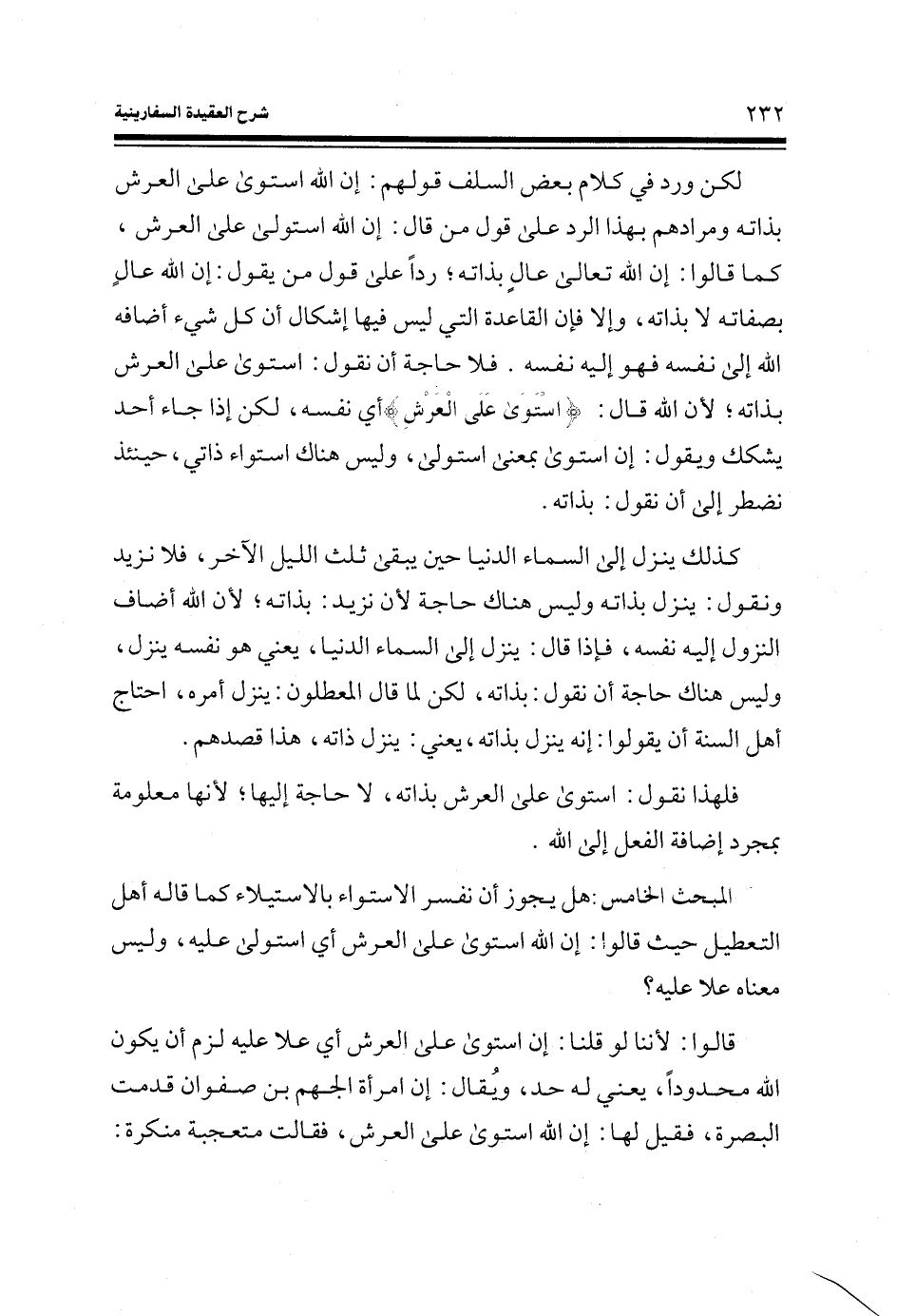 لكن ورد في كلام بعض السلف قولهم: إن الله استوى على العرش بذاته ومرادهم بهذا الرد على قول من قال: إن الله استولى على العرش، كما قالوا: إن الله تعالى عال بذاته؛ رداً على قول من يقول: إن الله عال بصفاته لا بذاته، وإلا فإن القاعدة التي ليس فيها إشكال أن كل شيء أضافه الله إلى نفسه فهو إليه نفسه. فلا حاجة أن نقول: استوى على العرش بذاته؛ لأن الله قال: (اسْتَوَى عَلَى الْعَرْش) (الأعراف: الآية 54) أي نفسه، لكن إذا جاء أحد يشكك ويقول: إن استوى بمعنى استولى، وليس هناك استواء ذاتي، حينئذ نضطر إلى أن نقول: بذاته.