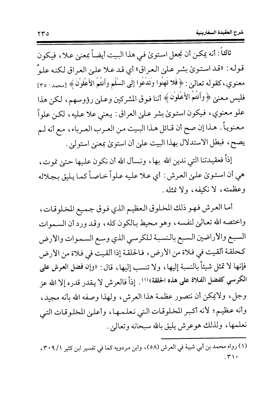 ثالثا: أنه يمكن أن نجعل استوى في هذا البيت أيضاً بمعنى علا، فيكون قوله: ((قد استوى بشر على العراق) أي قد علا على العراق لكنه علو معنوي، كقوله تعالى: (فَلا تَهِنُوا وَتَدْعُوا إِلَى السَّلْمِ وَأَنْتُمُ الْأَعْلَوْنَ) (محمد: الآية 35) فليس معنى (وَأَنْتُمُ الْأَعْلَوْنَ) إننا فوق المشركين وعلى رؤوسهم، لكن هذا علو معنوي، فيكون استوى بشر على العراق يعني علا عليه، لكن علواً معنوياً. هذا إن صح أن قائل هذا البيت من العرب العرباء، مع أنه لم يصح، فبطل الاستدلال بهذا البيت على أن استوى بمعنى استولى.