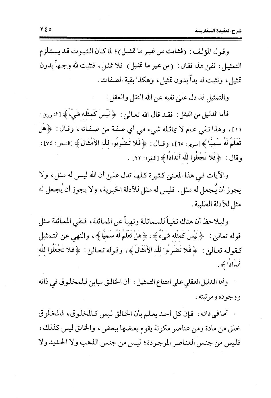 فأما الدليل من النقل: فقد قال الله تعالى: (لَيْسَ كَمِثْلِهِ شَيْء) (الشورى: الآية 11) ، وهذا نفي عام لا يماثله شيء في أي صفة من صفاته، وقال: (هَلْ تَعْلَمُ لَهُ سَمِيّاً) (مريم: الآية 65) ، وقال: (فَلا تَضْرِبُوا لِلَّهِ الْأَمْثَالَ) (النحل: الآية 74) ، وقال: (فَلا تَجْعَلُوا لِلَّهِ أَنْدَاداً) (البقرة: الآية 22)