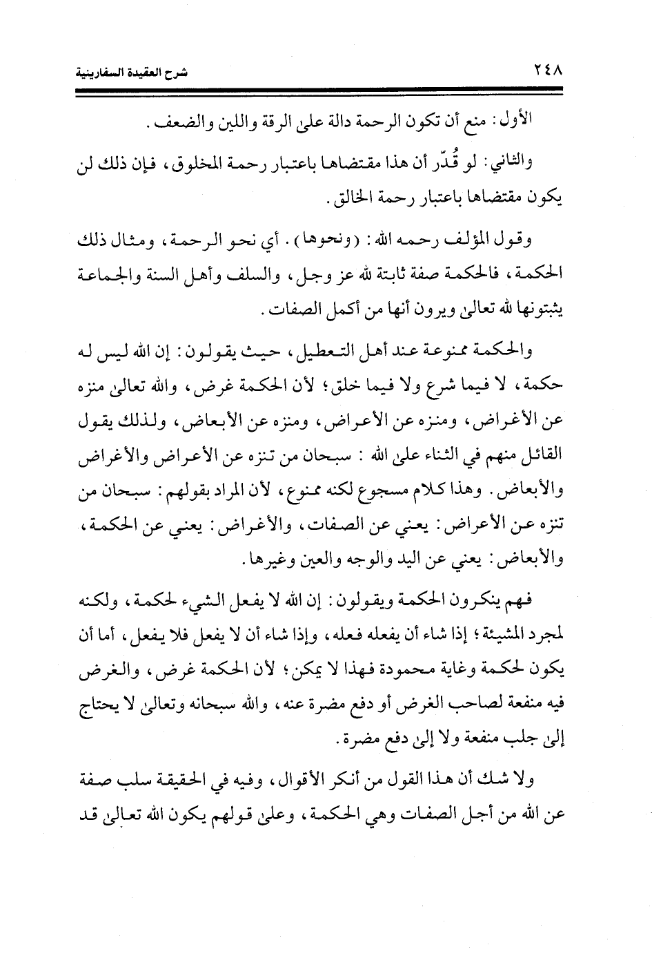 والحكمة ممنوعة عند أهل التعطيل، حيث يقولون: إن الله ليس له حكمة، لا فيما شرع ولا فيما خلق؛ لأن الحكمة غرض، والله تعالى منزه عن الأغراض، ومنزه عن الأعراض، ومنزه عن الأبعاض، ولذلك يقول القائل منهم في الثناء على الله: سبحان من تنزه عن الأعراض والأغراض والأبعاض. وهذا كلام مسجوع لكنه ممنوع، لأن المراد بقولهم: سبحان من تنزه عن الأعراض: يعني عن الصفات، والأغراض: يعني عن الحكمة، والأبعاض: يعني عن اليد والوجه والعين وغيرها.