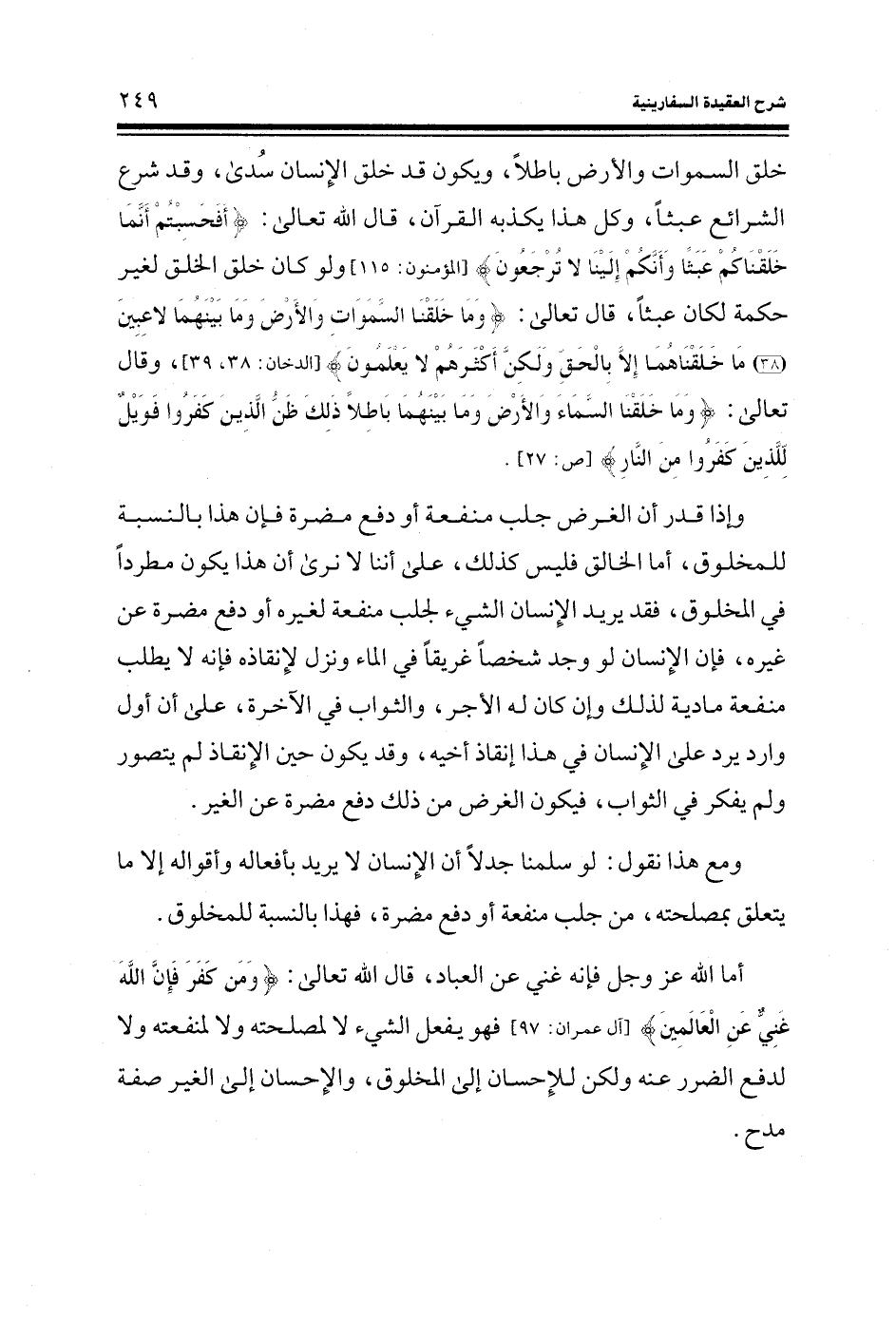 وإذا قدر أن الغرض جلب منفعة أو دفع مضرة فإن هذا بالنسبة للمخلوق، أما الخالق فليس ذلك، على إننا لا نرى أن هذا يكون مطرداً في المخلوق، فقد يريد الإنسان الشيء لجلب منفعة لغيره أو دفع مضرة عن غيره، فإن الإنسان لو وجد شخصاً غريقاً في الماء ونزل لإنقاذه فإنه لا يطلب منفعة مادية لذلك وإن كان له الأجر، والثواب في الآخرة، على أن أول وارد يرد على الإنسان في هذا إنقاذ أخيه، وقد يكون حين الإنقاذ لم يتصور ولم يفكر في الثواب، فيكون الغرض من ذلك دفع ضرة عن الغير.
