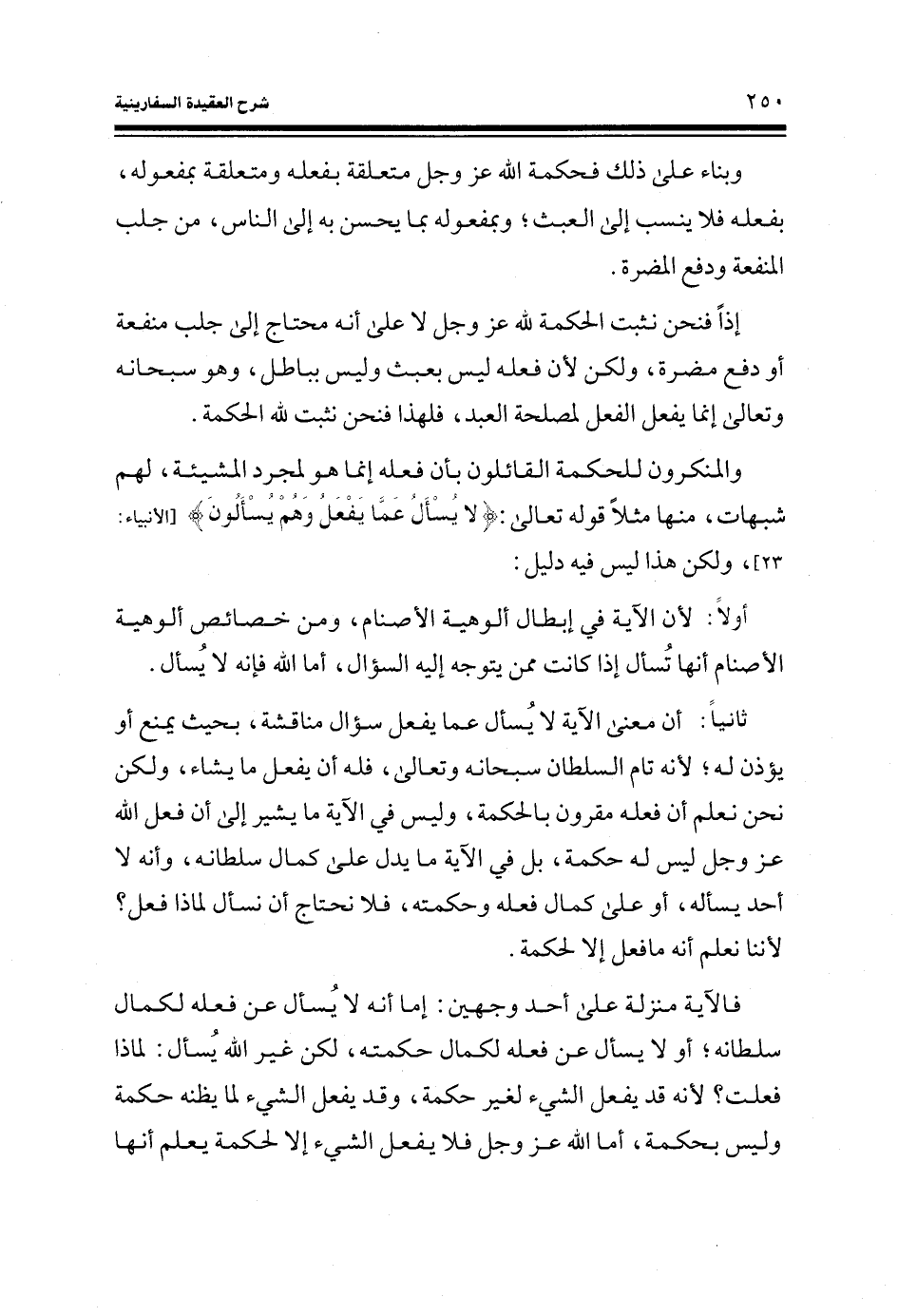 ثانياً: أن معنى الآية لا يسأل عما يفعل سؤال مناقشة، بحيث يمنع أو يؤذن له؛ لأنه تام السلطان سبحانه وتعالى، فله أن يفعل ما يشاء، ولكن نحن نعلم أن فعله مقرون بالحكمة، وليس في الآية ما يشير إلى أن فعل الله عز وجل ليس له حكمة، بل في الآية ما يدل على كمال سلطانه، وأنه لا أحد يسأله، أو على كمال فعله وحكمته، فلا نحتاج أن نسأل لماذا فعل؟ لأننا نعلم أنه ما فعل إلا لحكمة.