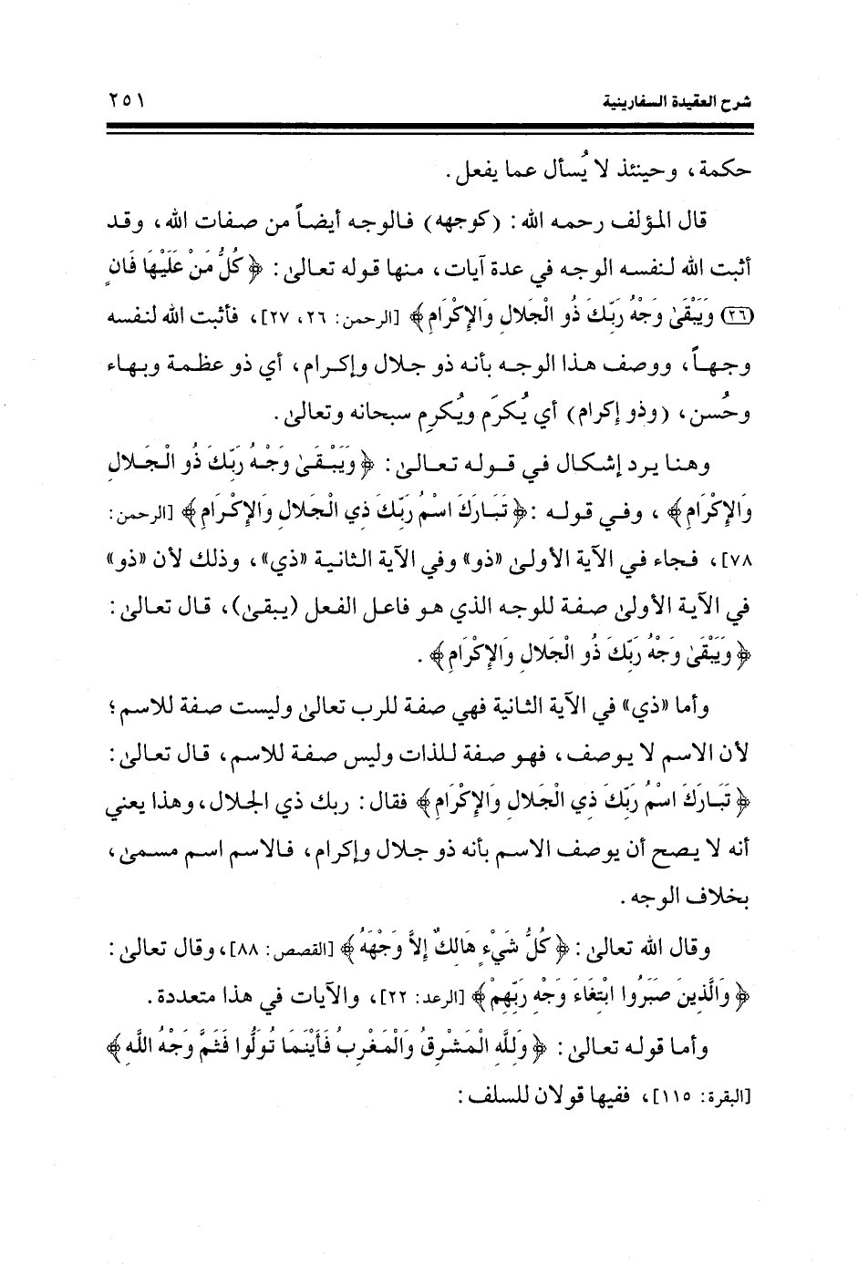 قال المؤلف رحمه الله: (كوجهه) فالوجه أيضاً من صفات الله، وقد أثبت الله لنفسه الوجه في عدة آيات، منها قوله تعالى: (كُلُّ مَنْ عَلَيْهَا فَانٍ) (الرحمن: 26) (وَيَبْقَى وَجْهُ رَبِّكَ ذُو الْجَلالِ والإكرام) (الرحمن: 27)) ، فأثبت الله لنفسه وجها، ووصف هذا الوجه بأنه ذو جلال وإكرام، أي ذو عظمة وبهاء وحسن، (وذو إكرام) أي يكرم ويكرم سبحانه وتعالى.