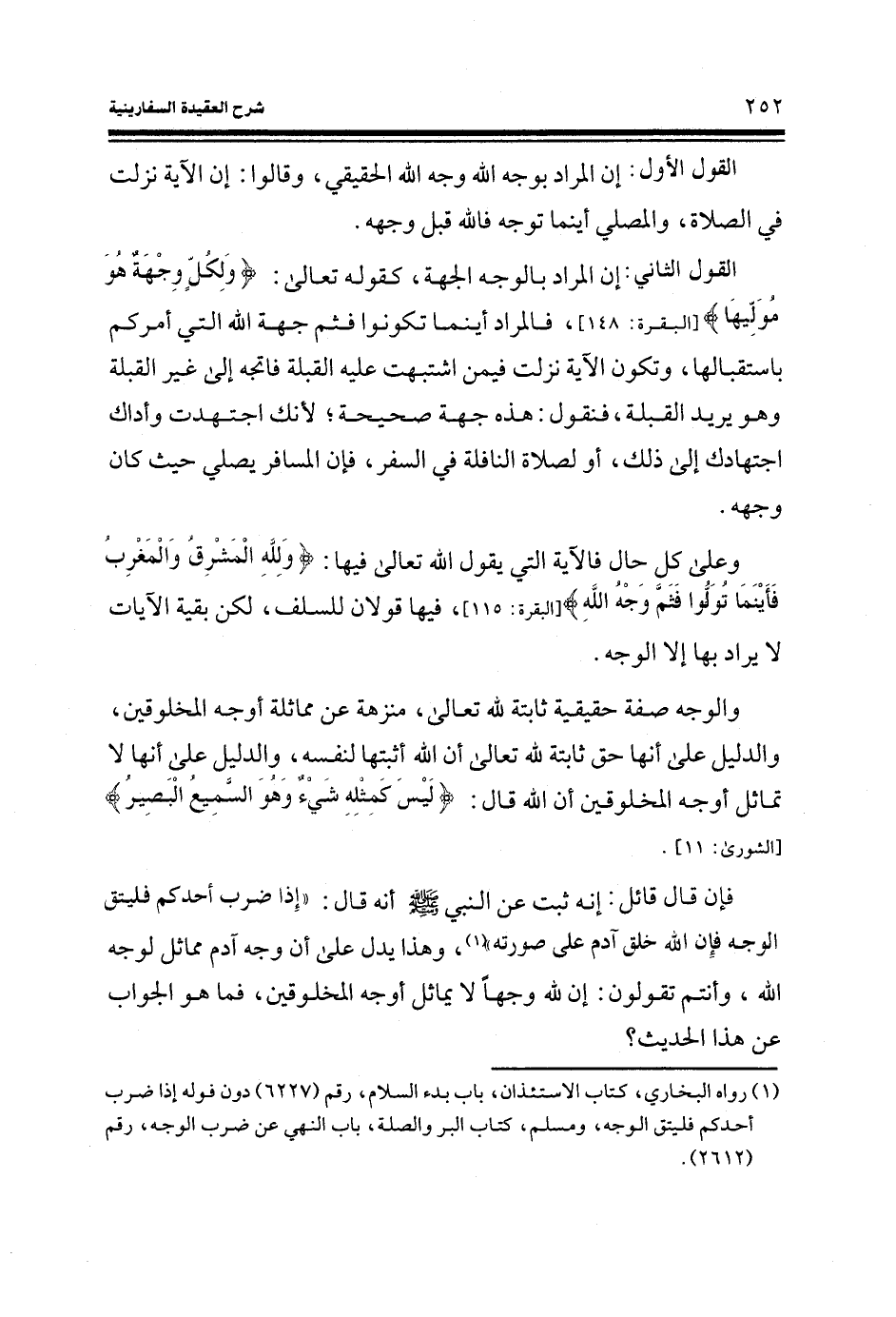 والوجه صفة حقيقية ثابتة لله تعالى، منزهة عن مماثلة أوجه المخلوقين، والدليل على أنها حق ثابتة لله تعالى أن الله أثبتها لنفسه، والدليل على أنها لا تماثل أوجه المخلوقين أن الله قال: (لَيْسَ كَمِثْلِهِ شَيْءٌ وَهُوَ السَّمِيعُ الْبَصِيرُ) (الشورى: الآية 11) .