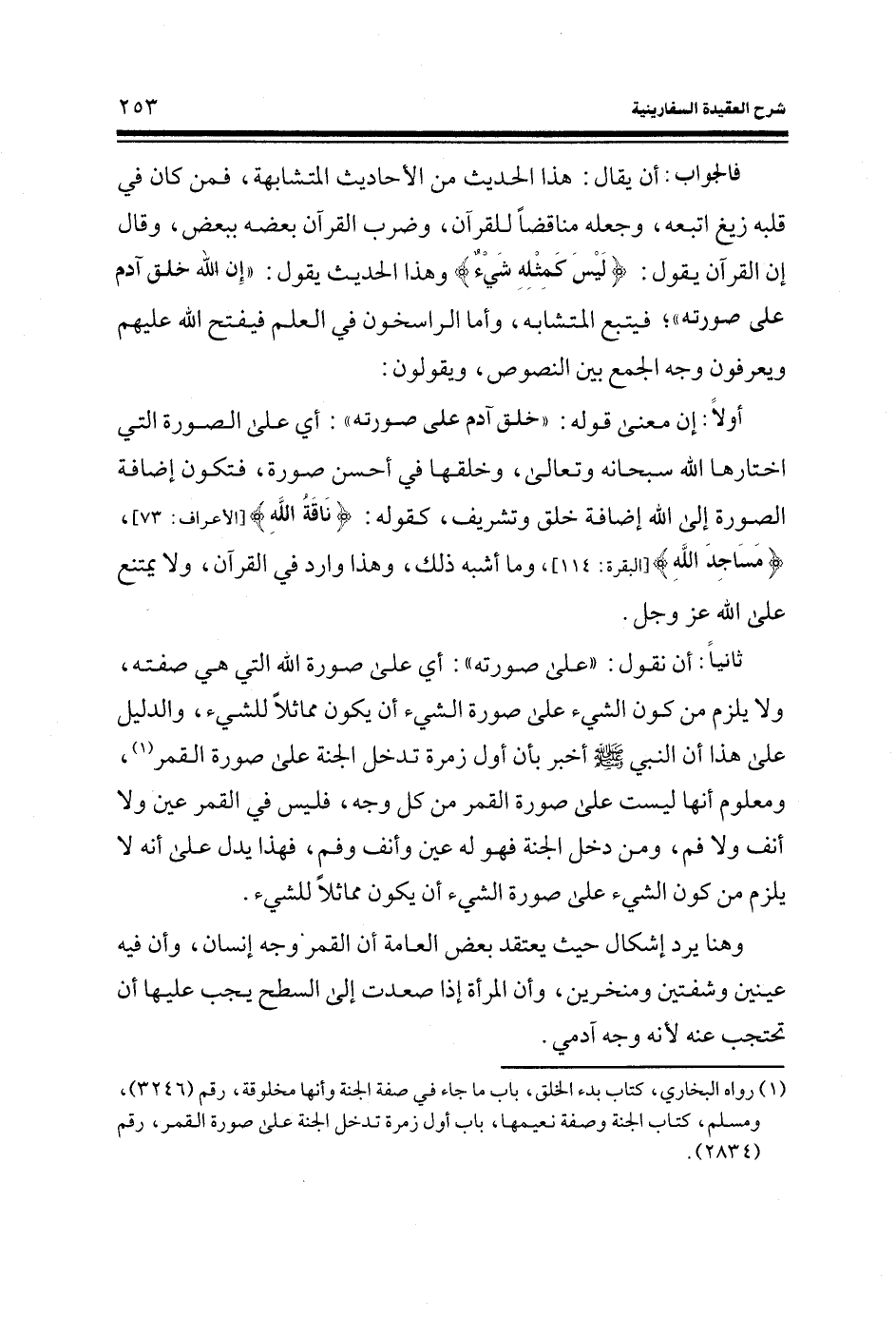 ثانياً: أن نقول: ((على صورته) : أي على صورة الله التي هي صفته، ولا يلزم من كون الشيء على صورة الشيء أن يكون مماثلاً للشيء، والدليل على هذا أن النبي صلى الله عليه وسلم أخبر بأن أول زمرة تدخل الجنة على صورة القمر (¬1) ، ومعلوم أنها ليست على صورة القمر من كل وجه، فليس في القمر عين ولا أنف ولا فم، ومن دخل الجنة فهو له عين وأنف وفم، فهذا يدل على أنه لا يلزم من كون الشيء على صورة الشيء أن يكون مماثلاً للشيء.