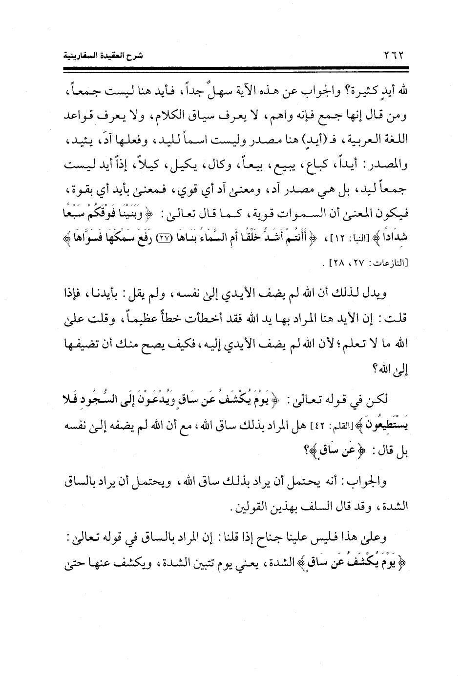 لكن في قوله تعالى: (يَوْمَ يُكْشَفُ عَنْ سَاقٍ وَيُدْعَوْنَ إِلَى السُّجُودِ فَلا يَسْتَطِيعُونَ) (القلم: 42)) هل المراد بذلك ساق الله، مع أن الله لم يضفه إلى نفسه بل قال: (عَنْ سَاقٍ) ؟