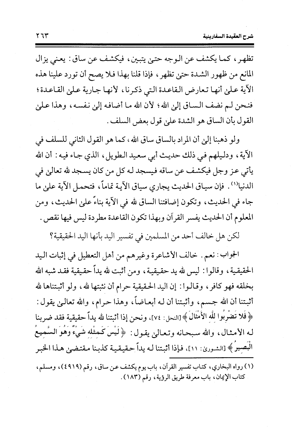 تظهر، كما يكشف عن الوجه حتى يتبين، فيكشف عن ساق: يعني يزال المانع من ظهور الشدة حتى تظهر، فإذا قلنا بهذا فلا يصح أن تورد علنا هذه الآية على أنها تعارض القاعدة التي ذكرنا، لأنها جارية على القاعدة؛ فنحن لم نضف الساق إلى الله؛ لأن الله ما أضافه إلى نفسه، وهذا على القول بأن الساق هو الشدة على قول بعض السلف.