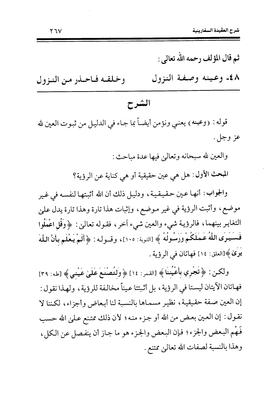 ولكن: (تَجْرِي بِأَعْيُنِنَا) (القمر: الآية 14) (وَلِتُصْنَعَ عَلَى عَيْنِي) (طه: الآية 39) فهاتان الآيتان ليستا في الرؤية، بل أثبتتا عيناً مخالفةً للرؤية، ولهذا نقول: إن العين صفةٌ حقيقيةٌ، نظير مسماها بالنسبة لنا أبعاض وأجزاء، لكننا لا نقول: إن العين بعض من الله أو جزء منه؛ لأن ذلك ممتنع على الله حسب فهم البعض والجزء؛ فإن البعض والجزء هو ما جاز أن ينفصل عن الكل، وهذا بالنسبة لصفات الله تعالى ممتنع.
