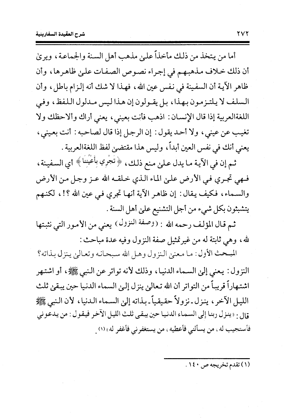 ثم قال المؤلف رحمه الله: (وصفة النزول) يعني من الأمور التي نثبتها لله، وهي ثابتةٌ له من غير تمثيل صفة النزول وفيه عدة مباحث: