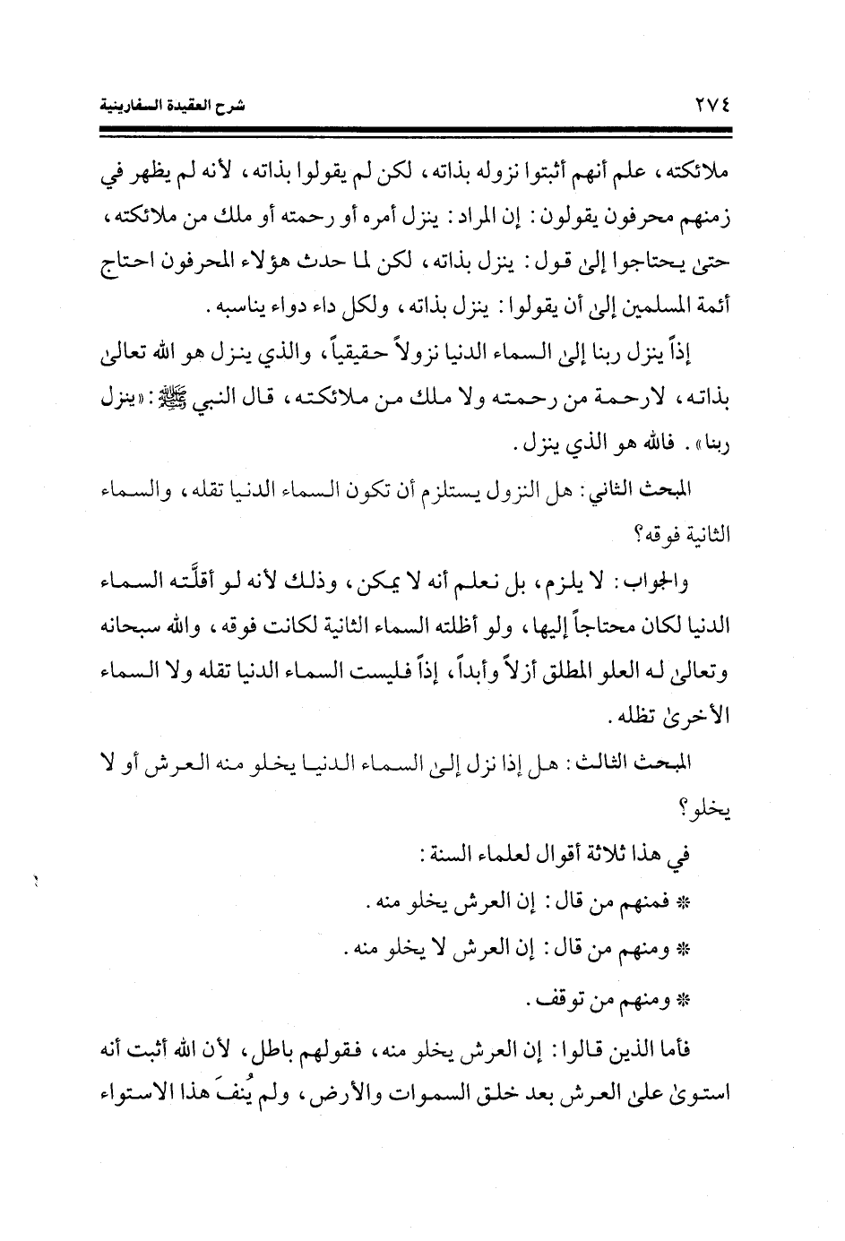 ملائكته، علم أنهم أثبتوا نزوله بذاته، لكن لم يقولوا بذاته، لأنه لم يظهر في زمنهم محرفون يقولون: إن المراد: ينزل أمره أو رحمته أو مَلك من ملائكته حتى يحتاجوا إلى قول: ينزل بذاته، لكن لما حدث هؤلاء المحرفون احتاج أئمة المسلمين إلى أن يقولوا ينزل بذاته، ولكل داءٍ دواءٌ يناسبه. إذاً ينزل ربنا إلي السماء نزولاً حقيقياً، والذي ينزل هو الله تعالى بذاته، لا رحمةٌ من رحمته ولا مَلكٌ من ملائكته، والذي قال النبي صلى الله عليه وسلم: ((ينزل ربنا) . فالله هو الذي ينزل.