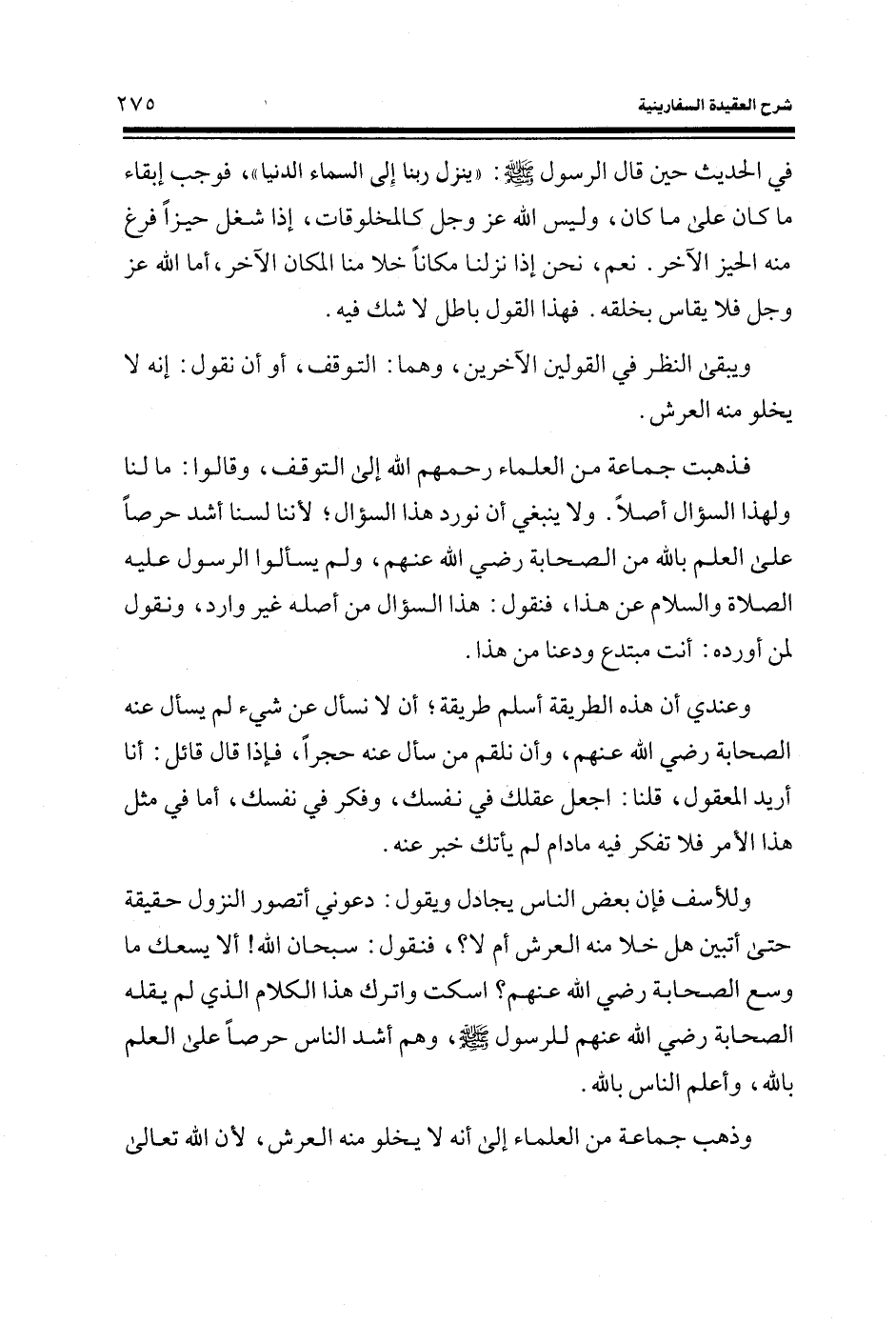 وللأسف فإن بعض الناس يجادل ويقول: دعوني أتصور النزول حقيقة حتى أتبين هل خلا منه العرش أم لا؟ ، فنقول: سبحان الله! ألا يسعك ما وسع الصحابة رضي الله عنهم؟ اسكت واترك هذا الكلام الذي لم يقله الصحابة رضي الله عنهم للرسول صلى الله عليه وسلم، وهم أشد الناس حرصاً على العلم بالله، وأعلم الناس بالله.