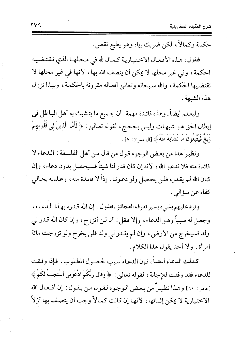 كذلك الدعاء أيضاً، فإن الدعاء سبب لحصول المطلوب، فإذا وفقت للدعاء فقد وفقت للإجابة، لقوله تعالى: (وَقَالَ رَبُّكُمُ ادْعُونِي أَسْتَجِبْ لَكُمْ) (غافر: من الآية 60) وهذا نظيرٌ من بعض الوجوه لقول من يقول: إن أفعال الله الاختيارية لا يمكن إثباتها، لأنها إن كانت كمالاً وجب أن يتصف بها أزلاً