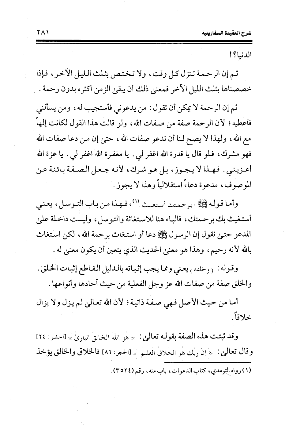 ثم إن الرحمة لا يمكن أن تقول: من يدعوني فأستجيب له، ومن يسألني فأعطيه؛ لأن الرحمة صفة من صفات الله، ولو قالت هذا القول لكانت إلهاً مع الله، ولهذا لا يصح لنا أن ندعو صفات الله، حتى إن من دعا صفات الله فهو مشرك، فلو قال يا قدرة الله اغفر لي. يا مغفرة الله اغفر لي. يا عزة الله أعزيني. فهذا لا يجوز، بل هو شرك، لأنه جعل الصفة بائنة عن الموصوف، مدعوة دعاء استقلالياً وهذا لا يجوز.