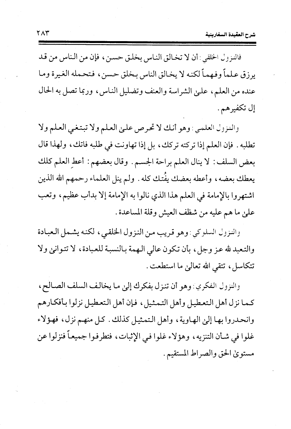 والنزول الفكري: وهو أن تنزل بفكرك إلى ما يخالف السلف الصالح، كما نزل أهل التعطيل وأهل التمثيل، فإن أهل التعطيل نزلوا بأفكارهم وانحدروا بها إلى الهاوية، وأهل التمثيل كذلك. كل منهم نزل، فهؤلاء غلوا في شأن التنزيه، وهؤلاء غلوا في الإثبات، فتطرفوا جميعاً فنزلوا عن مستوى الحق والصراط المستقيم.