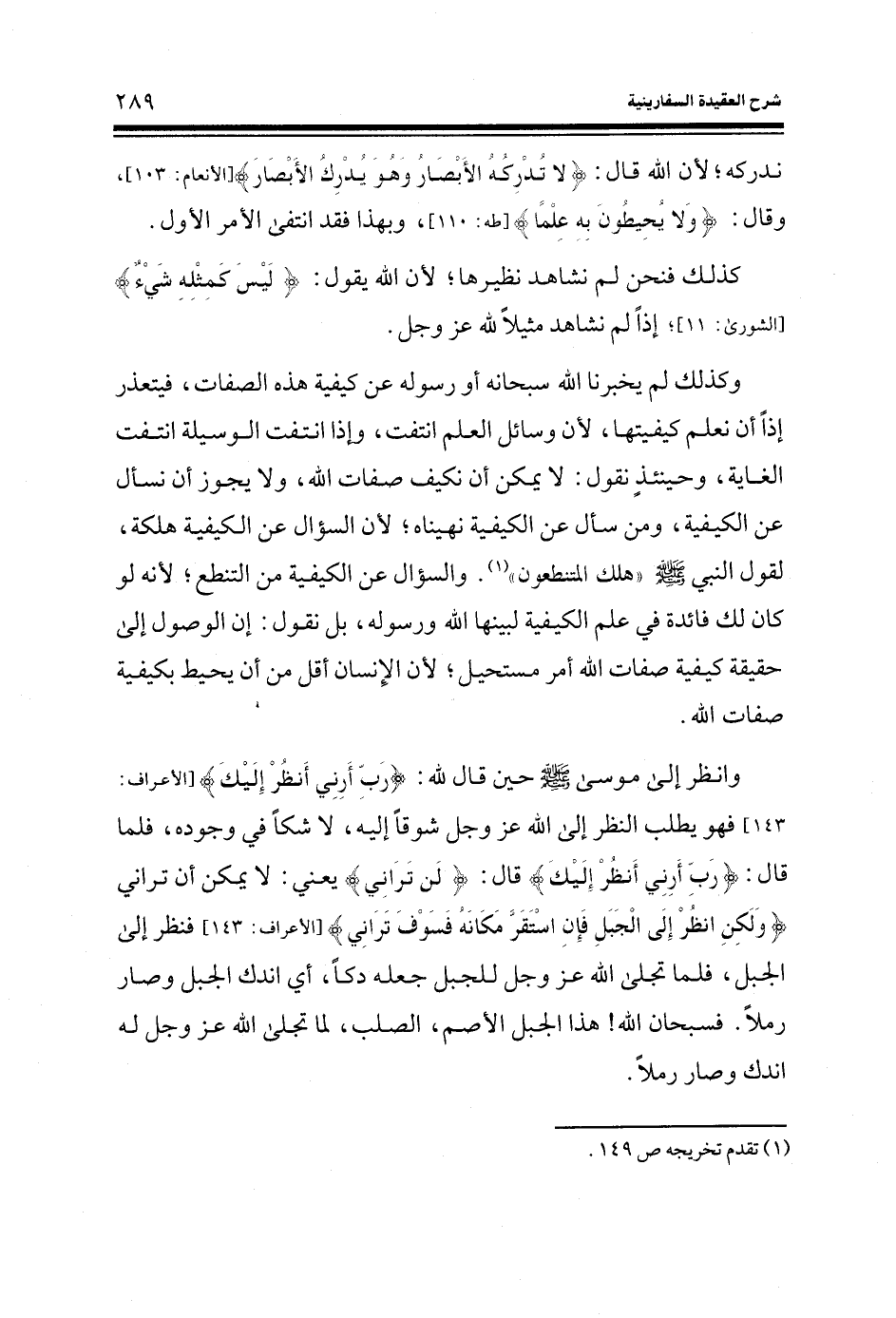 وكذلك لم يخبرنا الله سبحانه أو رسوله عن كيفية هذه الصفات، فيتعذر إذاً أن نعلم كيفيتها، لأن وسائل العلم انتفت، وإذا انتفت الوسيلة انتفت الغاية، وحينئذٍ نقول: لا يمكن أن نكيف صفات الله، ولا يجوز أن نسأل عن الكيفية، ومن سأل عن الكيفية نهيناه؛ لأن السؤال عن الكيفية هلكة، لقول النبي صلى الله عليه وسلم ((هلك المتنطعون) (¬1) . والسؤال عن الكيفية من التنطع؛ لأنه لو كان لك فائدة في علم الكيفية لبينها الله ورسوله، بل نقول: إن الوصول إلى حقيقة كيفية صفات الله أمرٌ مستحيل؛ لأن الإنسان أقل من أن يحيط بكيفية صفات الله.