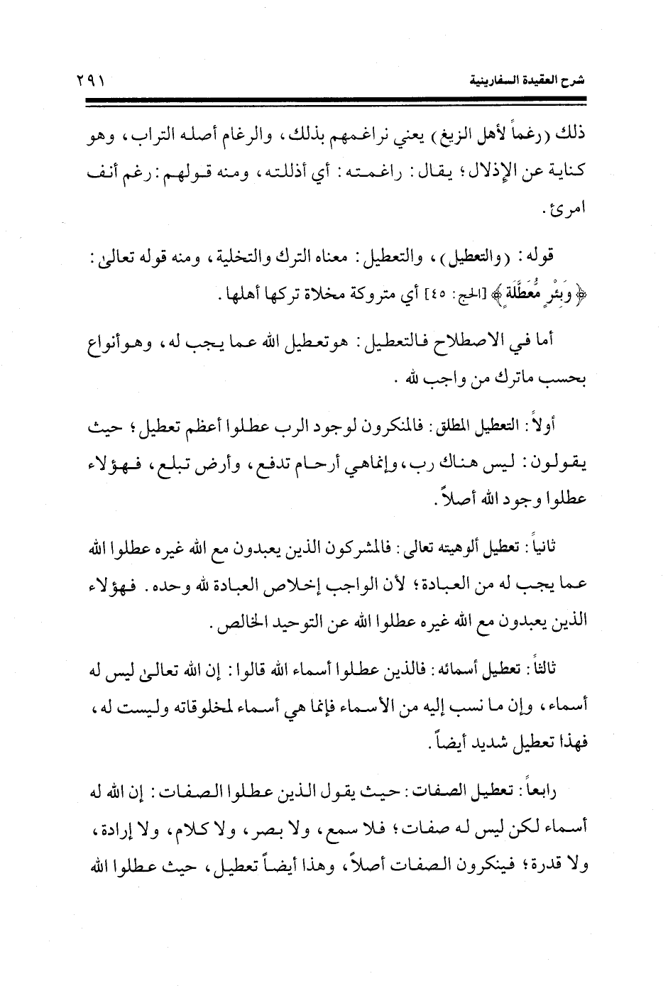 قوله: (والتعطيل) ، والتعطيل: معناه الترك والتخلية، ومنه قوله تعالى: (وَبِئْرٍ مُعَطَّلَة) (الحج: الآية 45) أي متروكة مخلاة تركها أهلها.