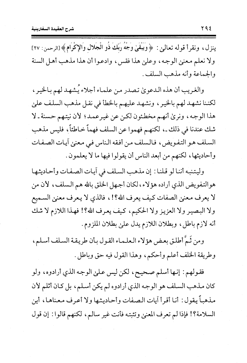 ينزل، ونقرأ قوله تعالى: (وَيَبْقَى وَجْهُ رَبِّكَ ذُو الْجَلالِ والإكرام) (الرحمن: 27) ولا نعلم معنى الوجه، وعلى هذا فقس، وادَّعوا أن هذا مذهب أهل السنة والجماعة وأنه مذهب السلف.