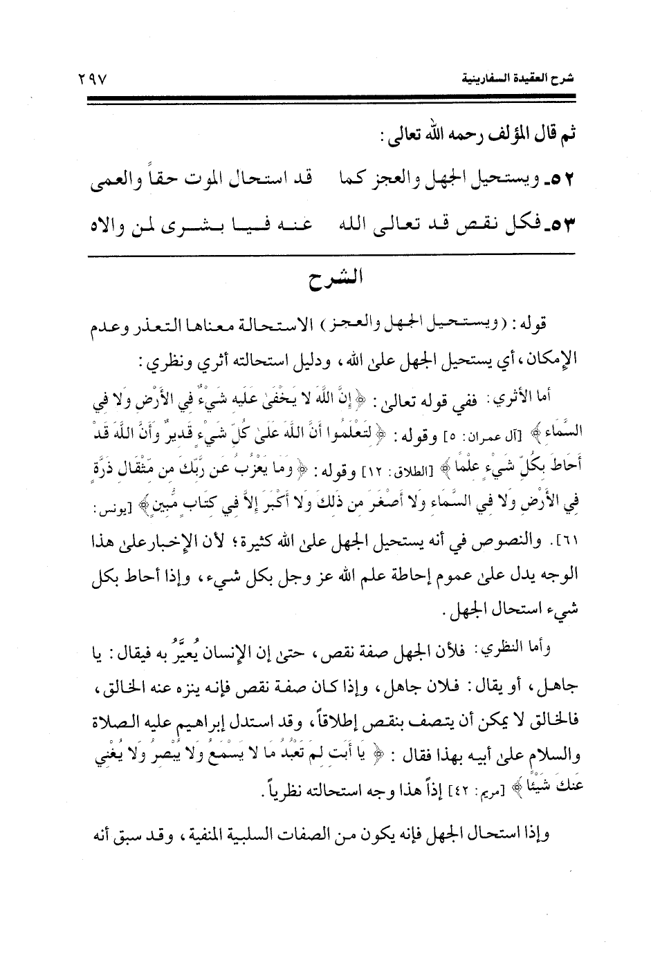 أما الأثري: ففي قوله تعالى: (إِنَّ اللَّهَ لا يَخْفَى عَلَيْهِ شَيْءٌ فِي الْأَرْضِ وَلا فِي السَّمَاءِ) (آل عمران: 5) وقوله: (لِتَعْلَمُوا أَنَّ اللَّهَ عَلَى كُلِّ شَيْءٍ قَدِيرٌ وَأَنَّ اللَّهَ قَدْ أَحَاَطَ بِكُلِّ شَيْءٍ عِلْماً) (الطلاق: الآية 12) وقوله (وَمَا يَعْزُبُ عَنْ رَبِّكَ مِنْ مِثْقَالِ ذَرَّةٍ فِي الْأَرْضِ وَلا فِي السَّمَاءِ وَلا أَصْغَرَ مِنْ ذَلِكَ وَلا أَكْبَرَ إِلَّا فِي كِتَابٍ مُبِينٍ) (يونس: الآية 61) . والنصوص في أنه يستحيل الجهل على الله كثيرة؛ لأن الإخبار على هذا الوجه يدل على عموم إحاطة علم الله عز وجل بكل شيء، وإذا أحاط بكل شيء استحال الجهل.