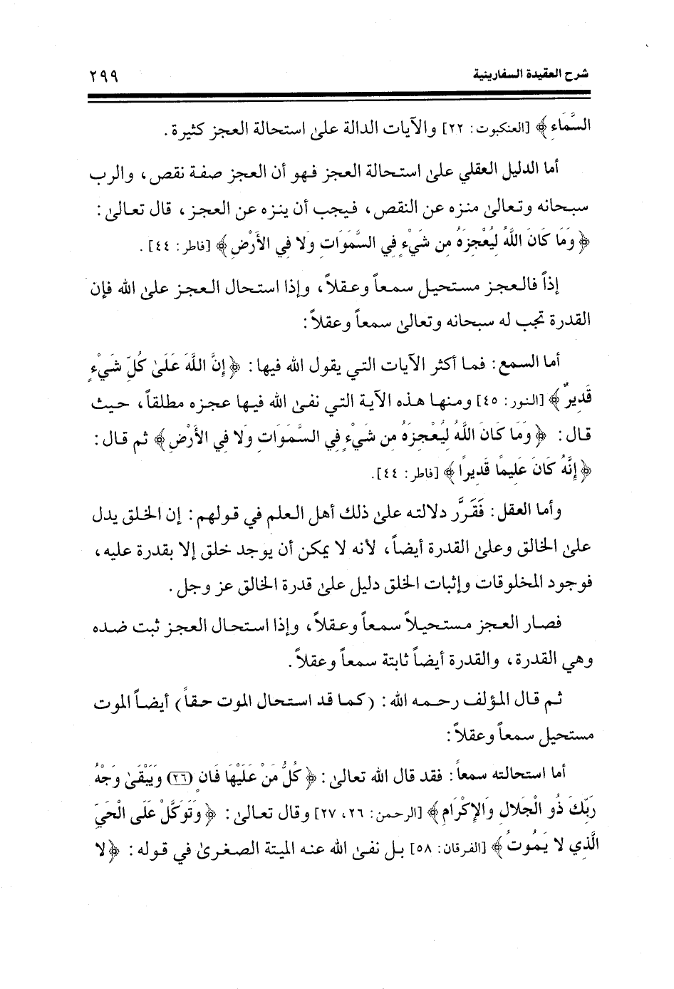 أما السمع: فما أكثر الآيات التي يقول الله فيها: (إِنَّ اللَّهَ عَلَى كُلِّ شَيْءٍ قَدِيرٌ) (النور: الآية 45) ومنها هذه الآية التي نفى الله فيها عجزه مطلقاً، حيث قال: (وَمَا كَانَ اللَّهُ لِيُعْجِزَهُ مِنْ شَيْءٍ فِي السَّمَوَاتِ وَلا فِي الْأَرْض) (فاطر: الآية 44) ثم قال: (إِنَّهُ كَانَ عَلِيماً قَدِيراً) (فاطر: الآية 44) .