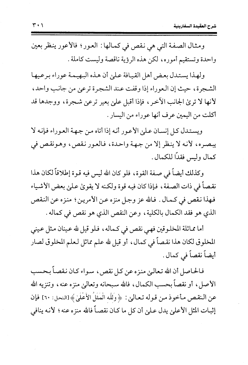 ومثال الصفة التي هي نقص في كمالها: العور؛ فالأعور ينظر بعين واحدة وتستقيم أموره، لكن هذه الرؤية ناقصة وليست كاملة.