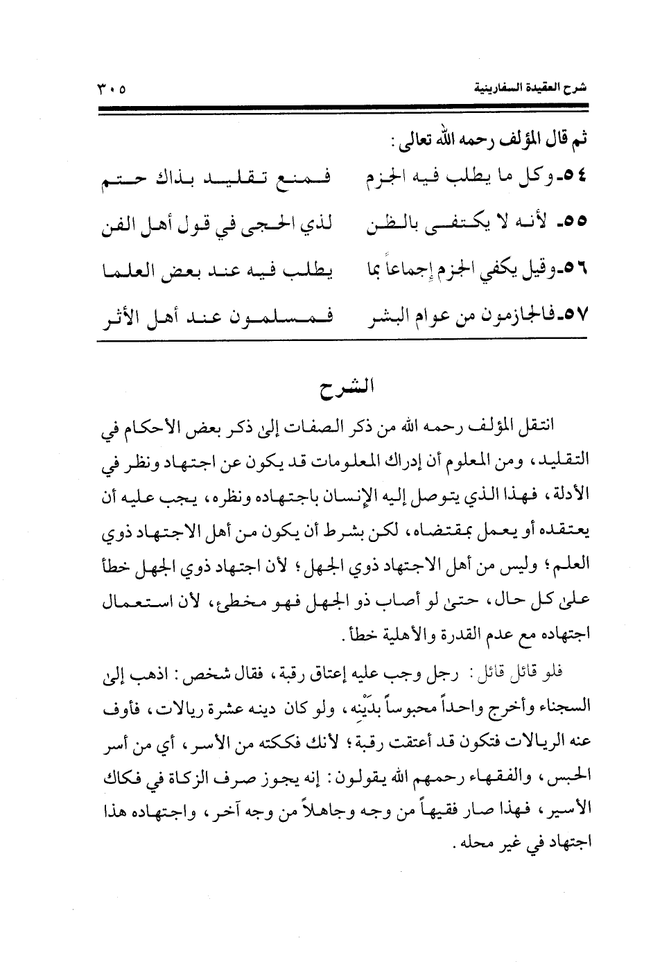 انتقل المؤلف رحمه الله من ذكر الصفات إلى ذكر بعض الأحكام في التقليد، ومن المعلوم أن إدراك المعلومات قد يكون عن اجتهاد ونظر في الأدلة، فهذا الذي يتوصل إليه الإنسان باجتهاده ونظره، يجب عليه أن يعتقده أو يعمل بمقتضاه، لكن بشرط أن يكون من أهل الاجتهاد ذوي العلم؛ وليس من أهل الاجتهاد ذوي الجهل؛ لأن اجتهاد ذوي الجهل خطأ على كل حال، حتى لو أصاب ذو الجهل فهو مخطئ، لأن استعمال اجتهاده مع عدم القدرة والأهلية خطأ.